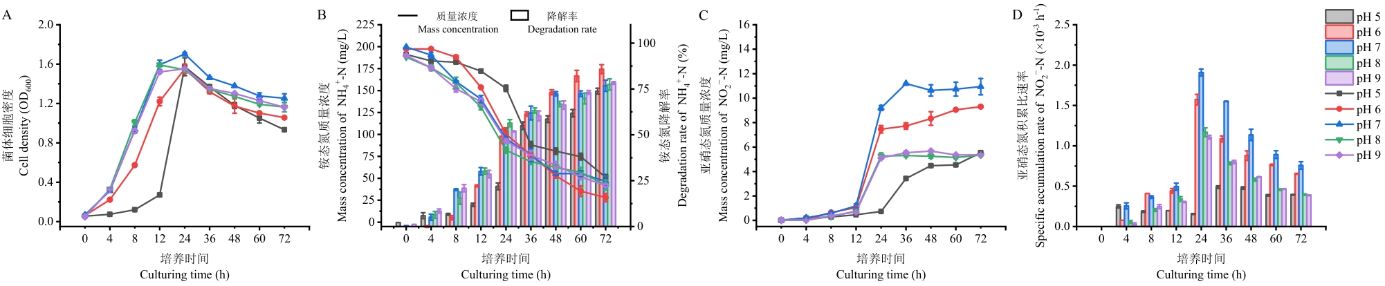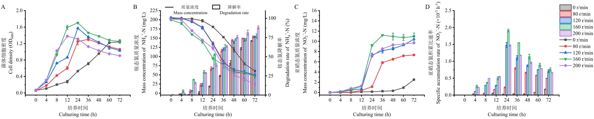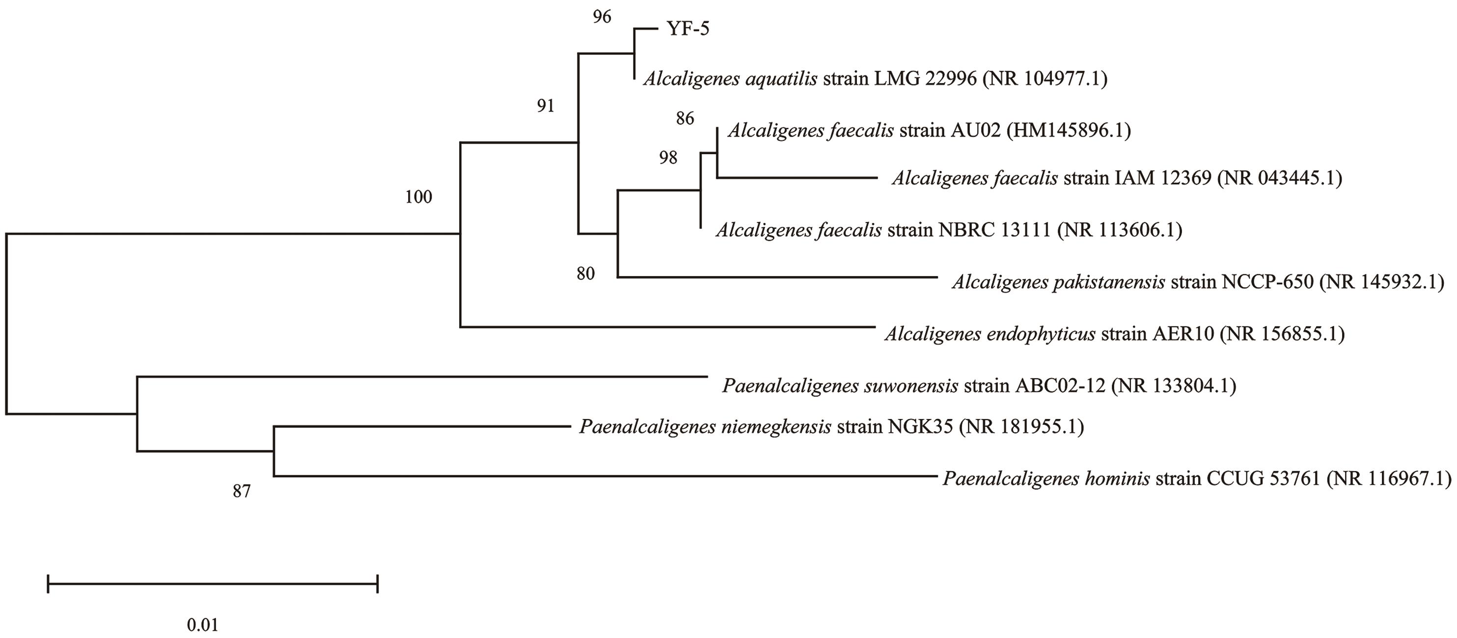 Objective To achieve efficient nitrogen retention during the aerobic composting of Chinese medicinal herbal residues (CMHRs), this study is aimed to isolate and identify microorganisms with high nitrification capacity and to elucidate their nitrification-denitrification characteristics, thereby providing potential microbial resources and a theoretical basis for developing nitrogen-conserving microbial agents. Method Pure strains were obtained from CMHRs compost using the enrichment culture, spread plate, and streak plate methods. Screening based on heterotrophic nitrification capability led to the selection of the high-efficiency strain. Identification of the strain was performed based on morphological characteristics and 16S rDNA gene sequencing. The effects of environmental factors on strain growth and nitrification capacity were investigated by adjusting six cultivation conditions: carbon source, carbon to nitrogen ratio (C/N), initial ammonium nitrogen concentration, pH, temperature, and rotational speed. The denitrification capability of strain YF-5 was examined by culturing it in media with nitrite nitrogen or nitrate nitrogen as the sole nitrogen source. Result A highly efficient nitrifying bacterium was isolated from the compost and named YF-5, which was identified as Alcaligenes aquatilis by morphological observation and molecular biology. Optimization experiments determined that the optimal nitrification conditions for this strain included a carbon source of sodium succinate, a C/N of 20, an initial ammonium nitrogen concentration of 100 mg/L, a pH of 7.0, a temperature of 35 ℃, and a rotation speed of 160 r/min. Analysis of nitrified products indicated that strain YF-5 performed heterotrophic nitrification with the accumulation of nitrite nitrogen. Denitrification experiments confirmed that strain YF-5 was incapable of employing nitrite or nitrate nitrogen as substrates for denitrification. Conclusion Strain YF-5 converts ammonium nitrogen into stable nitrite nitrogen under optimized conditions and lacks denitrification capability. This characteristic enables it to reduce both ammonia volatilization and denitrification through targeted nitrogen conversion during CMHRs composting, thereby minimizing nitrogen loss and demonstrating promising application potential.