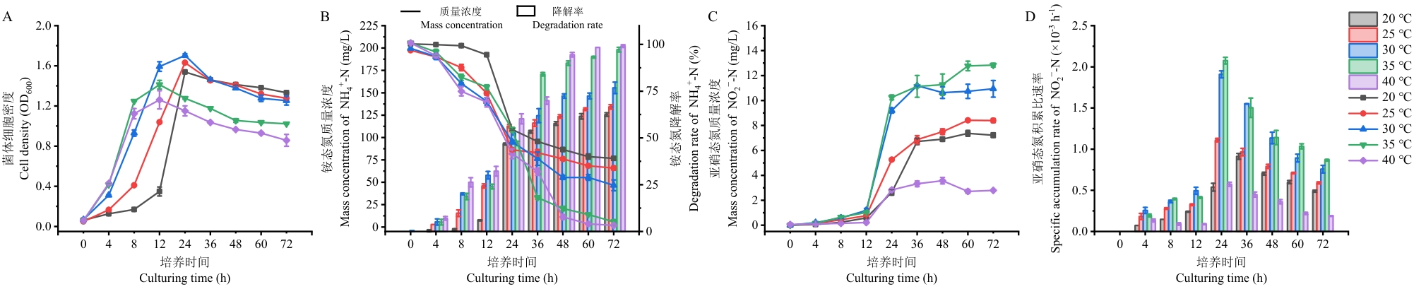 目的 为实现中药药渣好氧堆肥中氮素的高效保留,旨在寻找具有高效硝化能力的微生物并揭示其硝化反硝化特性,以期为开发保氮微生物菌剂提供菌种资源与理论依据。 方法 采用富集培养法、涂布平板法和划线分离法从中药药渣堆肥中获得纯化菌株。通过异养硝化能力测定,筛选出1株能够高效转化铵态氮的硝化菌株。结合形态学特征及16S rDNA基因测序对所得菌株进行鉴定。通过调整碳源、碳氮比(C/N)、初始铵态氮浓度、pH、温度、转速6种培养条件,探究环境因素对菌株生长及硝化能力的影响。在以亚硝态氮或硝态氮为唯一氮源的培养基中培养该菌株,检测其反硝化能力。 结果 从堆肥中分离得到1株高效硝化菌,命名为YF-5,形态学观察及分子生物学鉴定为水生产碱杆菌(Alcaligenes aquatilis)。优化实验确定该菌株最佳硝化条件为:琥珀酸钠作碳源、C/N 20、初始铵态氮浓度100 mg/L、pH 7.0、温度35 ℃、转速160 r/min。硝化产物分析显示,菌株YF-5进行异养硝化作用,其过程中伴有亚硝态氮的积累。反硝化实验证实,菌株YF-5无法利用亚硝态氮或硝态氮进行反硝化。 结论 菌株YF-5在优化条件下能将铵态氮转化为稳定的亚硝态氮,且不具备反硝化能力。这一特性使其在中药药渣堆肥应用中能够通过定向转化氮素,同步减少氨挥发与反硝化作用,从而降低堆肥过程中的氮素损失,展现出良好的应用潜力。