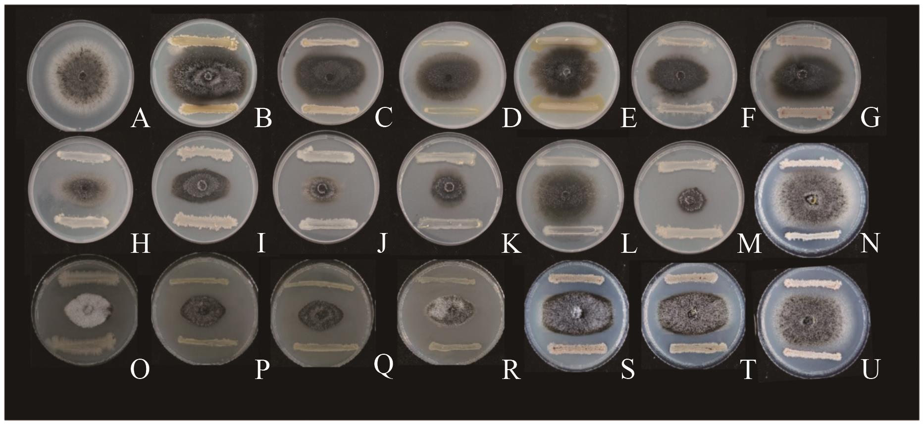 图1 不同细菌对马铃薯炭球炭疽菌的抑菌活性A:CK;B:QS10-1;C:QS10-2;D:QS10-3;E:QS10-4;F:QS10-5;G:QS10-6;H:QS2-4;I:QS2-5;J:QS2-7;K:QS2-11;L:QS2-12;M:QS2-13;N:QS10-15;O:QS10-16;P:QS2-15;Q:QS2-17;R:QS2-19;S:QS10-18;T:QS10-19;U:QS10-20