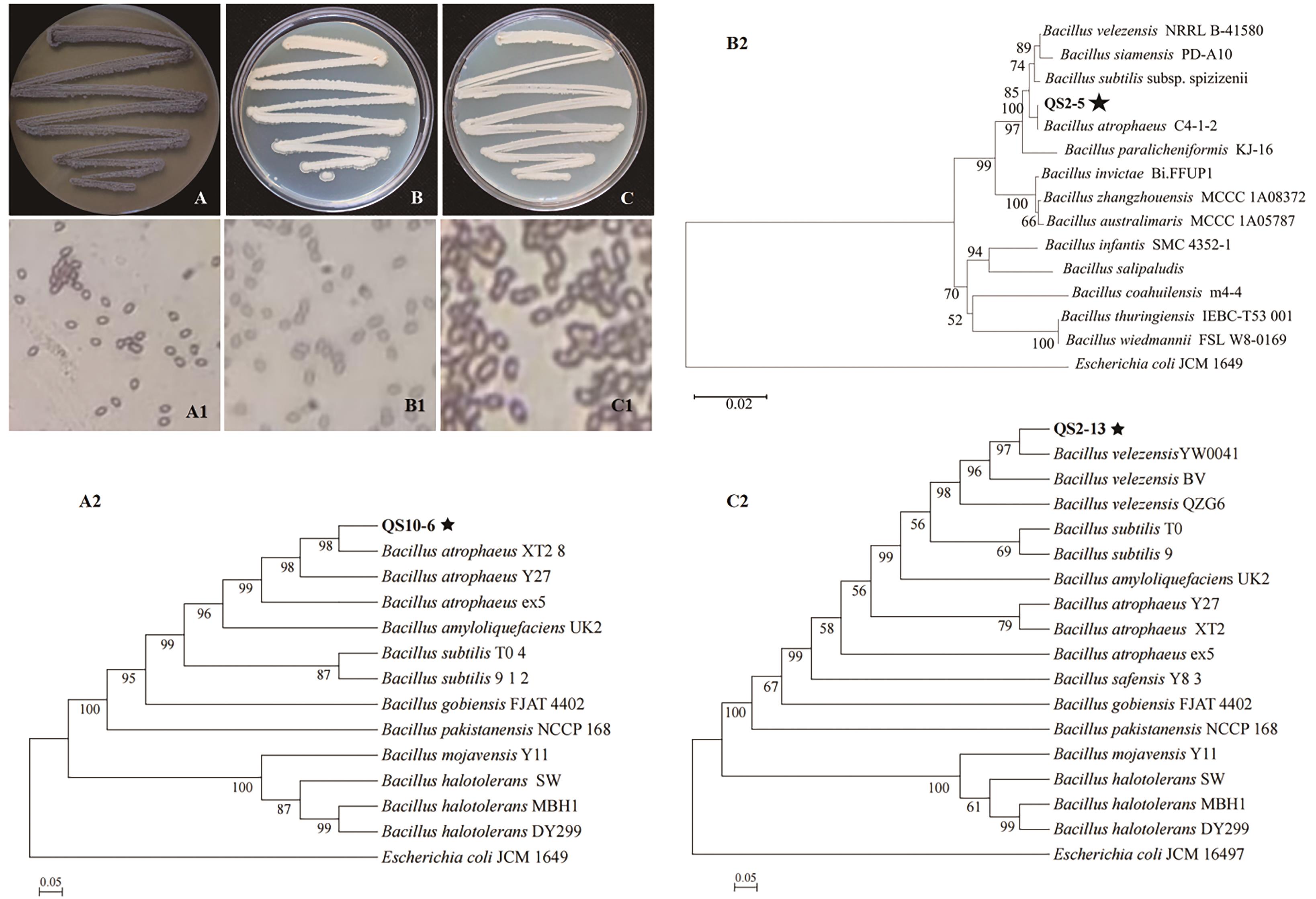 Fig. 2 Colony morphology and phylogenetic tree of strainsA: Colony morphology of QS10-6 on LB medium,the same below; B: QS2-5; C: QS2-13; A1:Gram stain morphology of strain QS10-6, the same below; B1: QS2-5; C1: QS2-13. A2: Polygenic phylogenetic tree of QS10-6 strain and related genes based on 16S rDNA, gyrA and rpoD, the same below; B2: QS2-5; C2: QS2-13