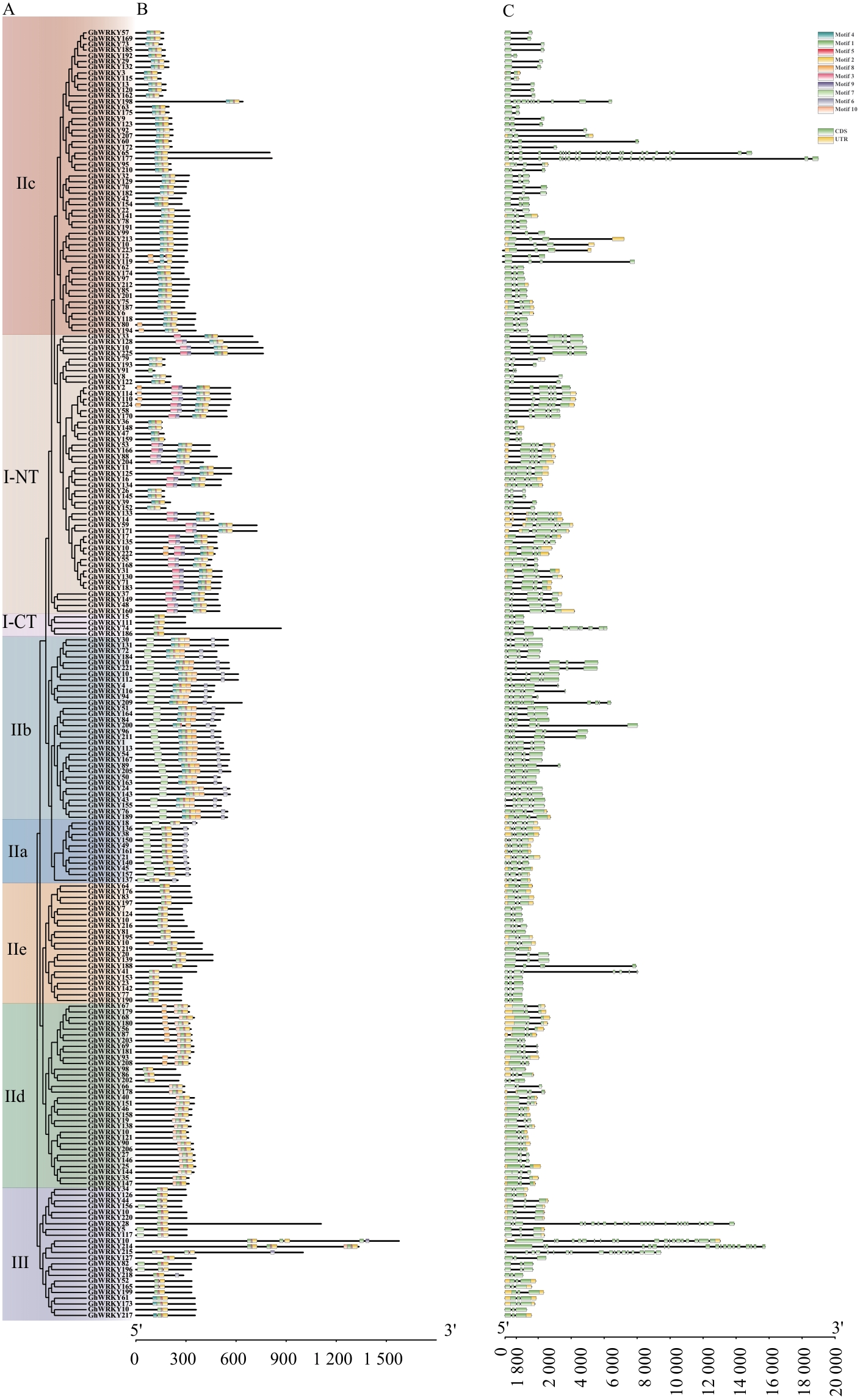 Fig. 4 Conserved motifs and gene structure analysis of GhWRKY gene family membersA: Phylogenetic tree of the GhWRKY family protein in G. hirsutum. B: Conserved motif of GhWRKY proteins in G. hirsutum. C: Gene structure of the GhWRKY gene family in G. hirsutum
