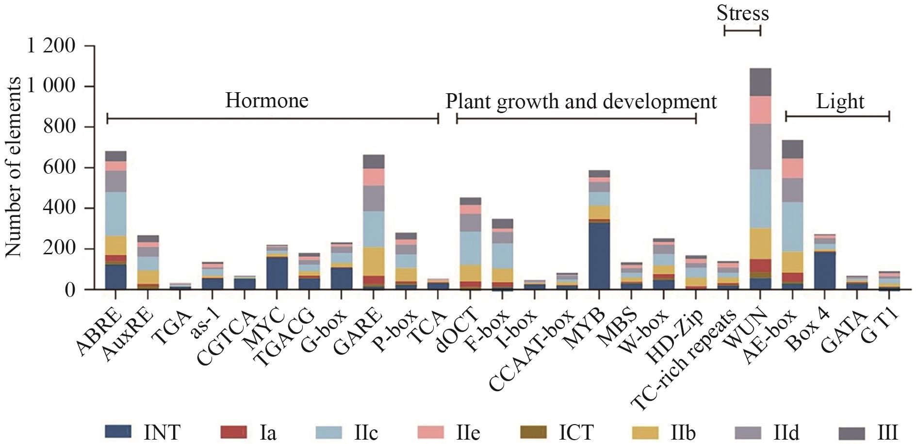 图4 GhWRKY基因家族成员保守基序和基因结构分析A:陆地棉GhWRKYs家族蛋白进化树;B:陆地棉GhWRKYs家族蛋白的保守基序;C:陆地棉GhWRKY基因家族的基因结构
