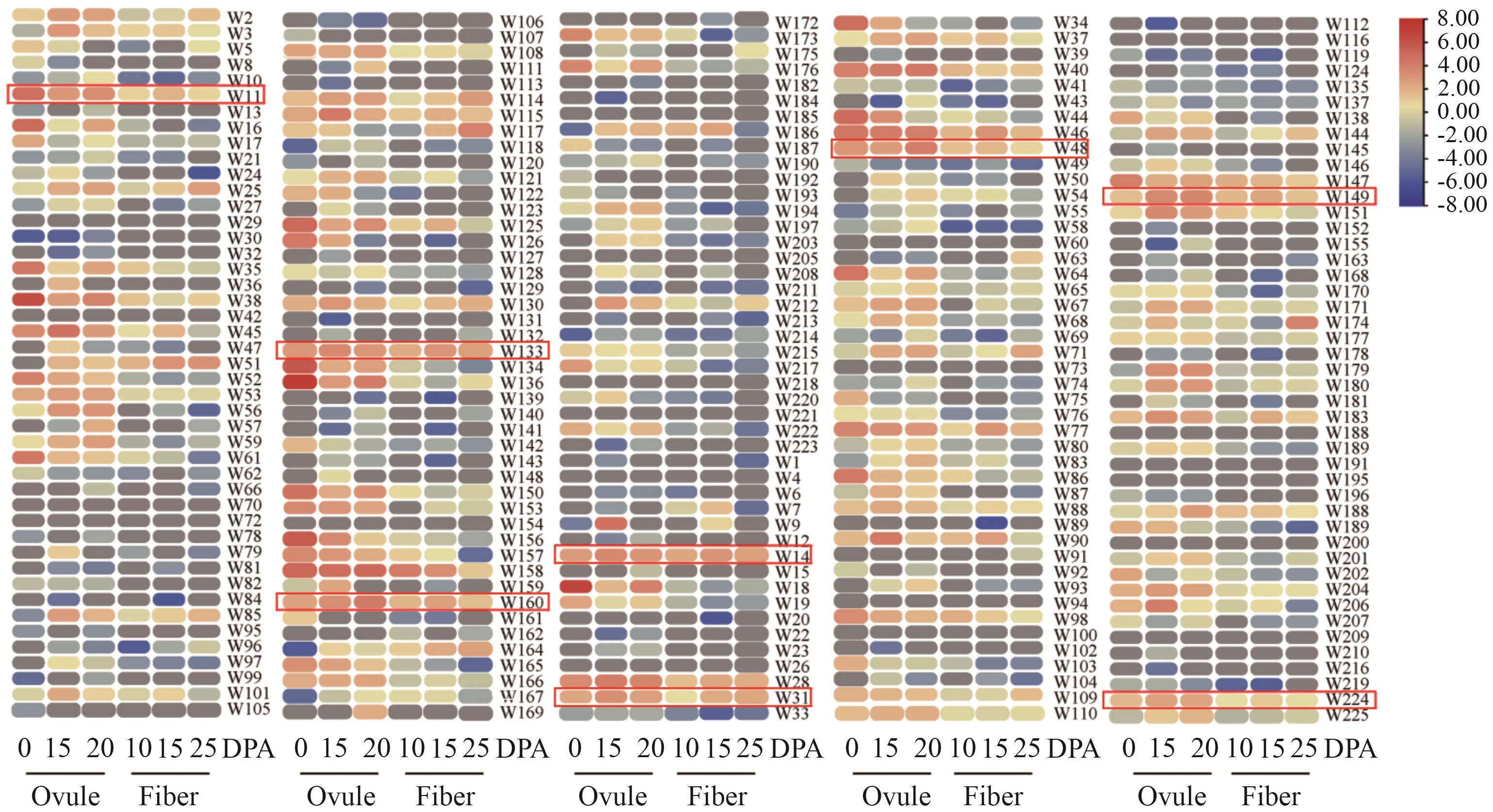 Fig. 6 Expression analysis of GhWRKYs during fiber developmentThe genes highlighted in red boxes are predominantly expressed during different developmental stages of fiber and ovule. DPA: Day post anthesis. The same below
