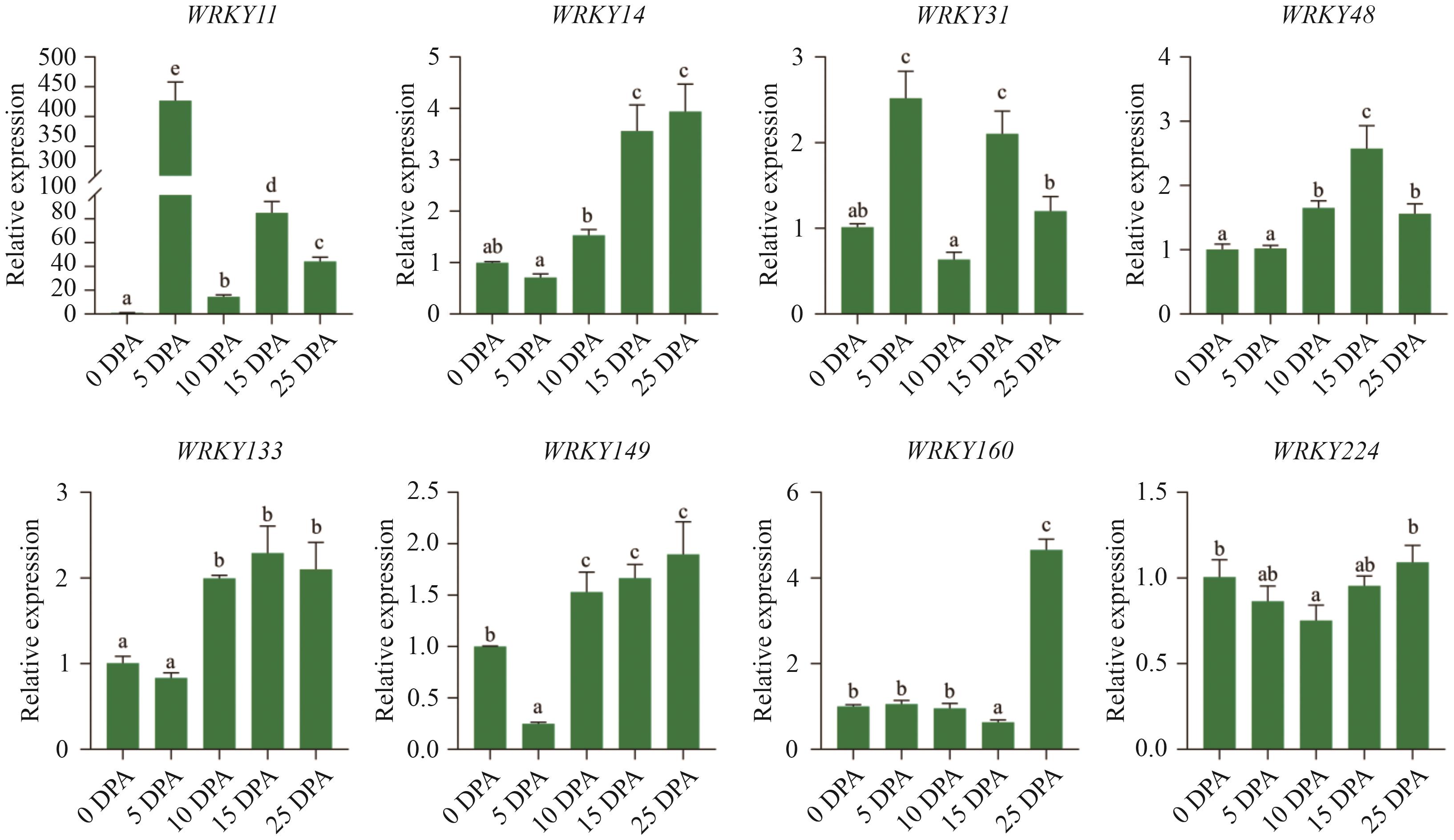 Fig. 7 Relative expressions of key GhWRKYs during different stages of cotton fiber developmentStatistical analyses were performed using the Tukey test. Different lower letters indicate significant difference of the expression of GhWRKYs at different stages of cotton fiber development (P<0.05)