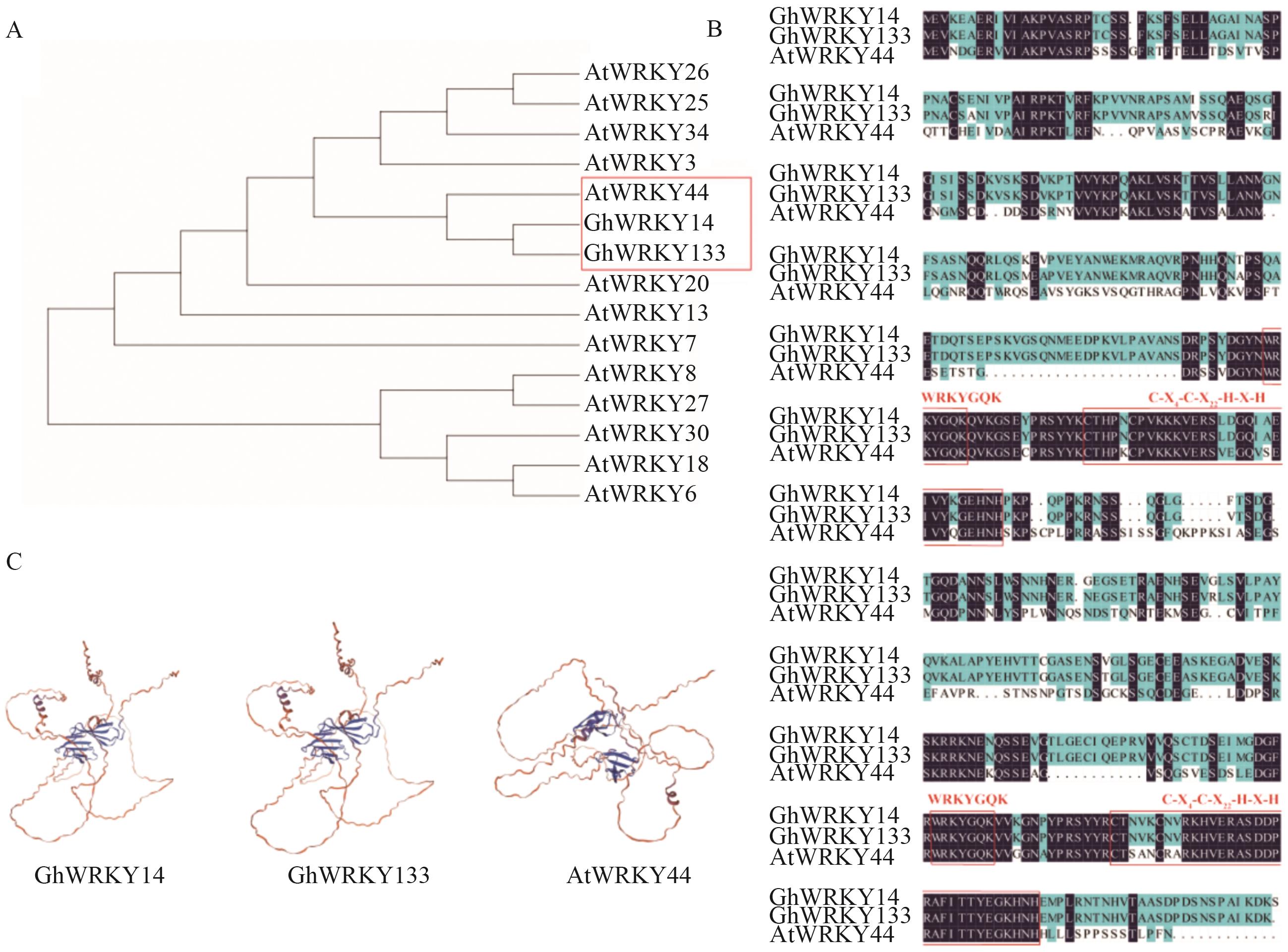 图8 GhWRKY44同源分析A:GhWRKY14(Gh_A04G096000.1)、GhWRKY133(Gh_D04G134100.1)和AtWRKY44(AT2G37260)系统进化树;B:GhWRKY14、GhWRKY133和AtWRKY44氨基酸序列比对分析;C:GhWRKY14、GhWRKY133和AtWRKY44蛋白三维结构