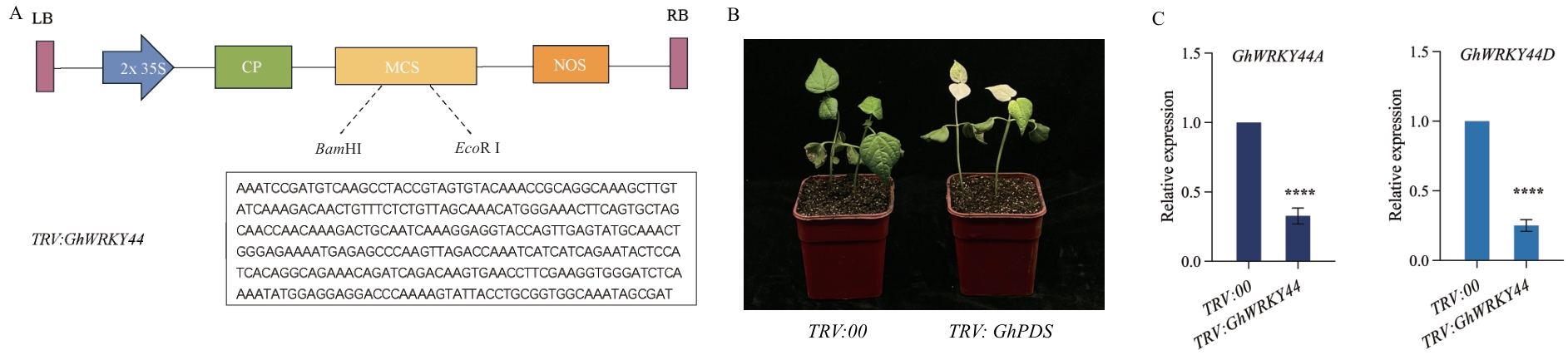 Fig. 10 Cultivating of TRV:GhWRKY44-silenced plantsA: Schematic diagram of VIGS silencing vector. B: Fourteen days after Agrobacterium infestation of cotton, TRV:GhPDS plants showed a distinct albino phenotype. C: RT-qPCR detection of GhWRKY44, silencing efficiency, n=35. GhHis3 was used as the internal reference gene, and the error line was the standard error of three biological replicates. Statistical analysis was performed using an independent variance t-test, * P<0.05, ** P<0.01, *** P<0.001, **** P<0.0001. The same below
