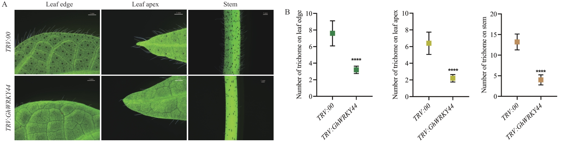 Fig. 11 Phenotypic characterization of epidermal trichomes in GhWRKY44-silenced plantsA: Trichome morphology of GhWRKY44-silenced plants. B: Statistical analysis of trichome density of GhWRKY44-silenced plants, n=15