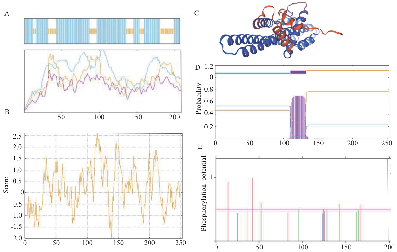 Fig. 3 Bioinformatics analysis ofSiSPX9proteinA: Prediction of secondary structure. B: Tertiary structure of SiSPX9 protein. C: Protein hydrophilicity/hydrophobicity prediction. D: Protein transmembrane structure prediction. E: Phosphorylation site prediction