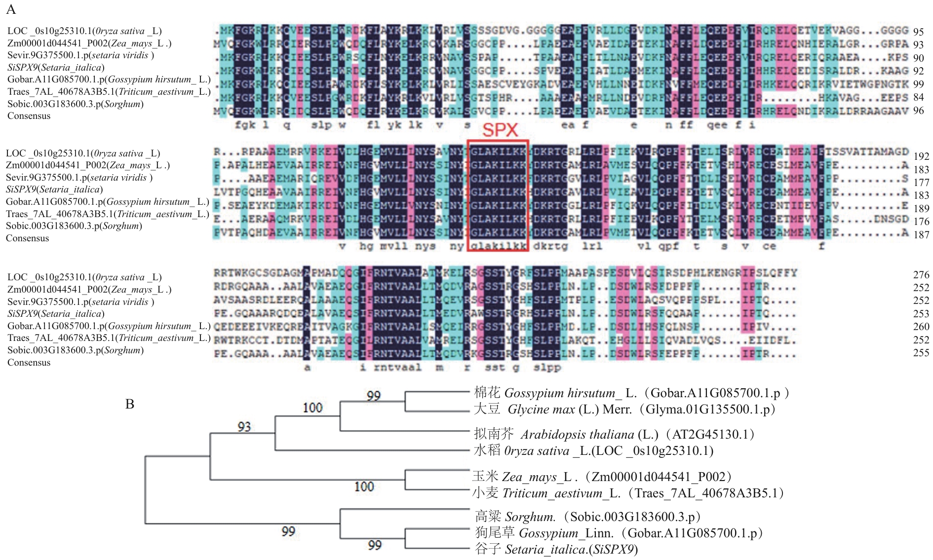 图4 SiSPX9蛋白序列比对和进化树构建A:不同植物SiSPX9蛋白序列比对,图中红色方框表示SPX蛋白的结构域;B:SiSPX9基因系统进化树