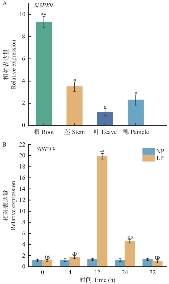 图5 谷子不同组织及低磷胁迫下SiSPX9的表达分析A:SiSPX9在谷子不同组织中的表达;B:SiSPX9在不同低磷胁迫时间下根中的表达情况,NP:正常磷处理(1 mmol/L KH₂PO₄);LP:低磷处理(1 μmol/L KH₂PO₄);*P<0.05,**P<0.01,ns表示差异不显著(P>0.05),下同