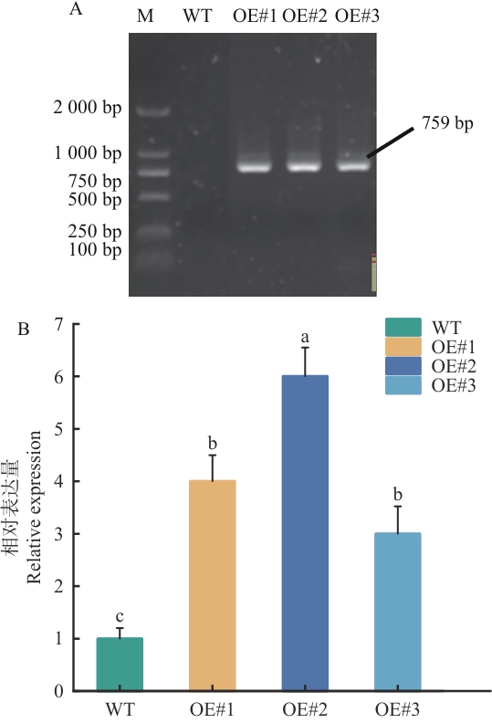 Fig. 6 Identificatied results of transgenic SiSPX9A. thaliana andexpression analysisA: PCR detection of transgenic Arabidopsis lines (M: DL2000 DNA marker; WT: wild-type Arabidopsis; OE#1-OE#3: Arabidopsis transformed with pBI121-SiSPX9). B: qPCR analysis of transgenic Arabidopsis lines. OE#1-OE#3 indicates overexpression-positive lines. Significant differences were determined by Duncan’s new multiple range test (P<0.05). Different lowercase letters indicate statistically significant differences. Error bars indicate the standard deviation (SD) of three independent biological replicates. Relative expression of the target gene is normalized to Actin. The same below