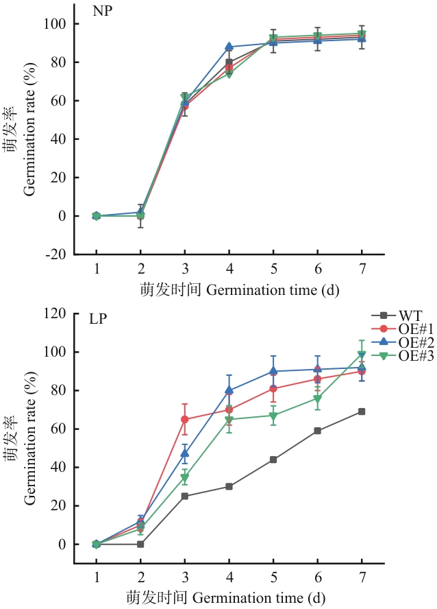 图7 SiSPX9转基因株系萌发率对每次测量使用3个生物学重复进行数据量化,每个重复50粒种子;每个数据点表示3次独立试验的平均值(±标准差)