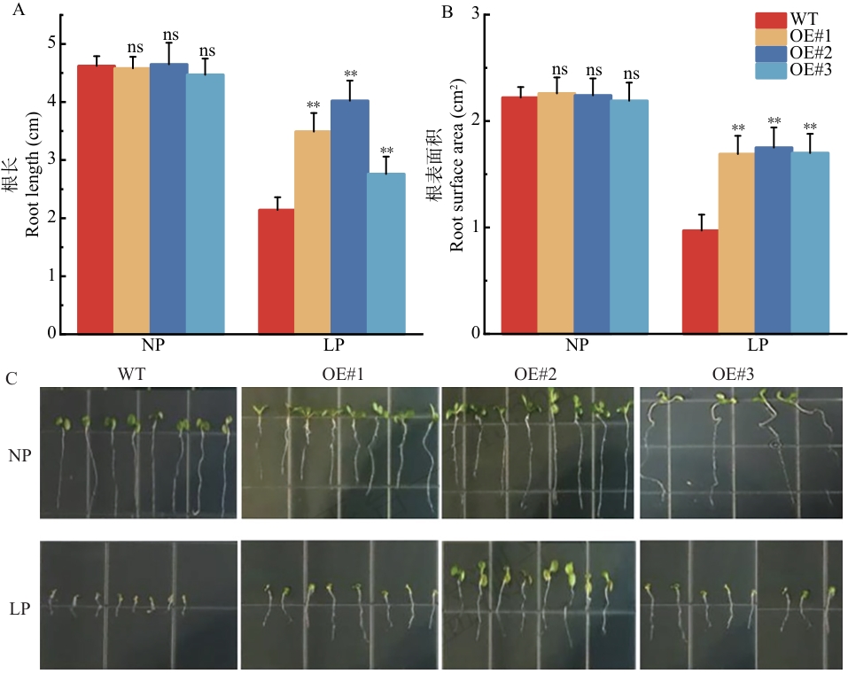 Fig. 5 Tissue-specific and low-phosphorus stress-induced expression of SiSPX9 in foxtail milletA: Expressions of SiSPX9 in different tissues of foxtail millet (Setaria italica). B: Expression patterns of SiSPX9 in roots under low-phosphorus stress at different time points. NP: Normal phosphorus treatment (1 mmol/L KH₂PO₄); LP: Low phosphorus treatment (1 μmol/L KH₂PO₄). *P<0.05, **P< 0.01, ns indicates no significant difference (P>0.05). The same below