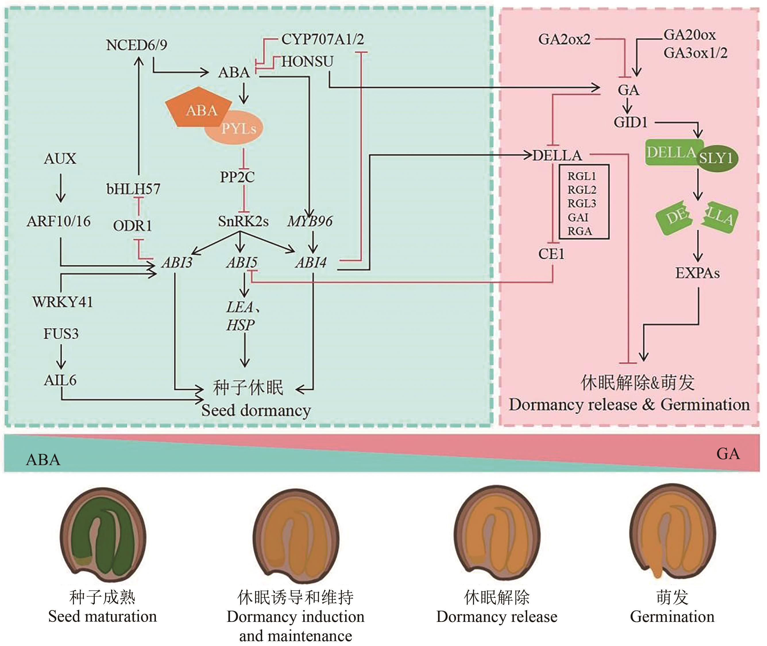 | ABI4 | 降低 | 正调控ABA信号途径,抑制种子萌发 | PIF4和ABI4形成转录激活复合体,促进休眠 | [ |
