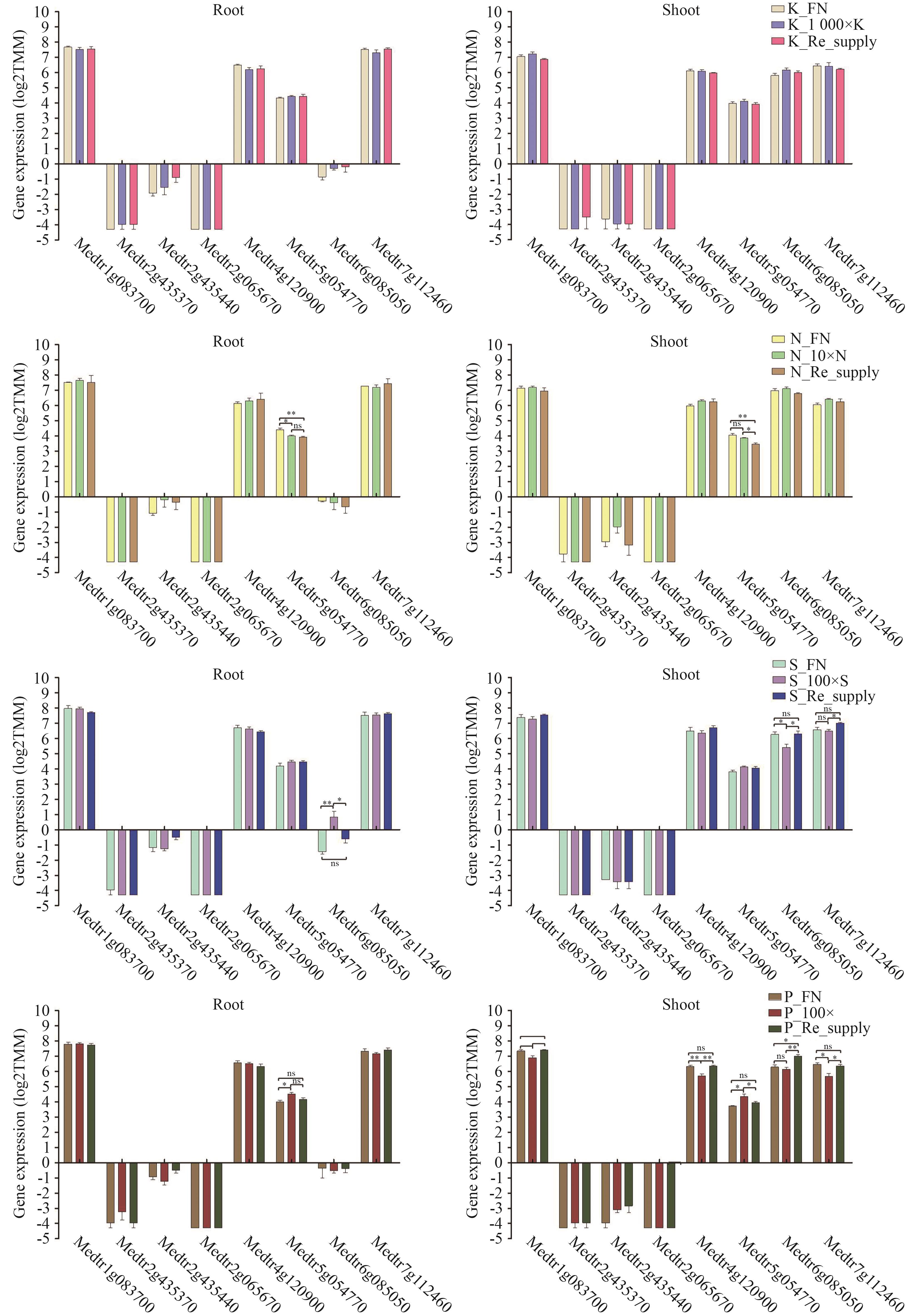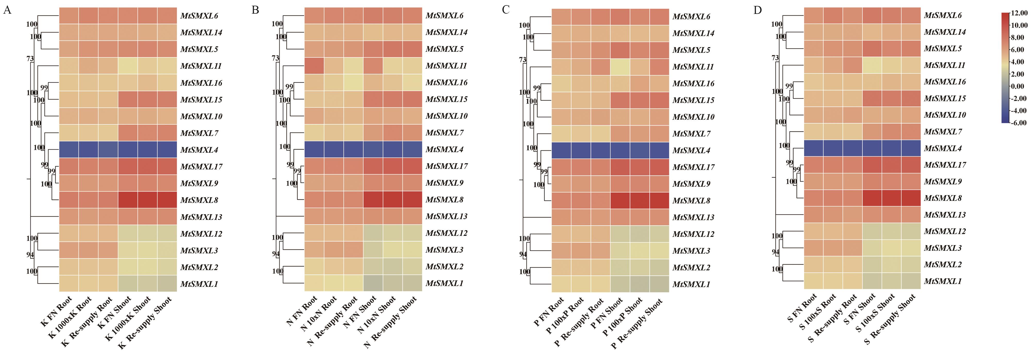 Objective SMXLs (SUPPRESSOR of MAX2 1-LIKE) are key repressors in the signal transduction pathway of the important plant hormone strigolactones (SLs) and major components of the karrikin (KARs) signaling pathway. The genome-wide identification of SMXL gene family members in Medicago truncatula and analysis of their expression pattern changes under abiotic stresses were conducted to provide theoretical support for the study of related gene families in legumes and lay a foundation for in-depth research on the functions of MtSMXL genes in the future. Method Employing bioinformatics methods, based on the reported amino acid sequences encoded by the SMXL family in plants, the genome-wide identification of SMXL family members in M. truncatula was performed. Tools such as TBtools were used for evolutionary and functional analyses of MtSMXL members. Meanwhile, transcriptome data were utilized to analyze the expressions of these members in different tissues, as well as their expressions under nutrient deficiency stress treatments (potassium, nitrogen, phosphorus, and sulfur deficiency) and abiotic stress treatments (cold,drought,and high salt). Result Through evolutionary analysis, a total of 17 MtSMXL members were identified. They were divided into three groups (G1-G3) with reference to gene structure and conserved domains. The upstream promoter regions of MtSMXLs contained a variety of cis-acting elements involved in responding to plant hormones and abiotic stresses, with differences in the type and number of these elements among different members. Synteny analysis revealed that WGD events in legumes play a crucial role in the expansion of the MtSMXL gene family. Significant differences were observed in the expression patterns of family members across different tissues and in response to various stresses. Functional candidate genes involved in responses to various stresses were selected through analysis. Conclusion Different groups of SMXL genes in M. truncatula present significant differences in structure and function during evolution, and the expression patterns of members vary under different stresses. Among them, MtSMXL2/7/11 can be used for the study of K/N/S/P element deficiency stress response pathways, while MtSMXL7/8/13/14/16 can be applied to the studies on the response pathways to drought, cold, and high salt stress.