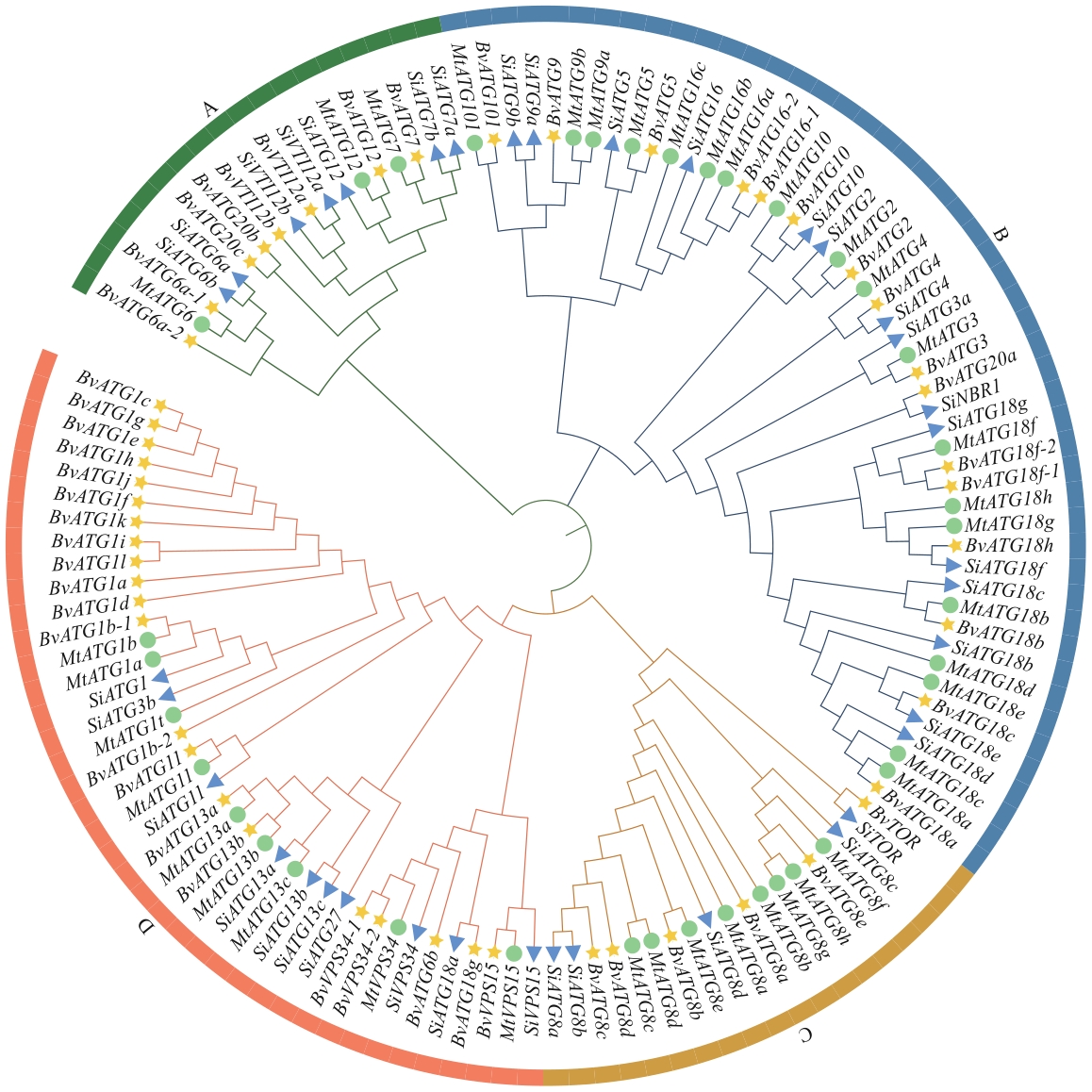 图2 高等植物ATGs系统进化分析黄色五角星代表甜菜,绿色圆圈表示苜蓿,蓝色三角形表示谷子;ATGs基因名称和登录号见附表2