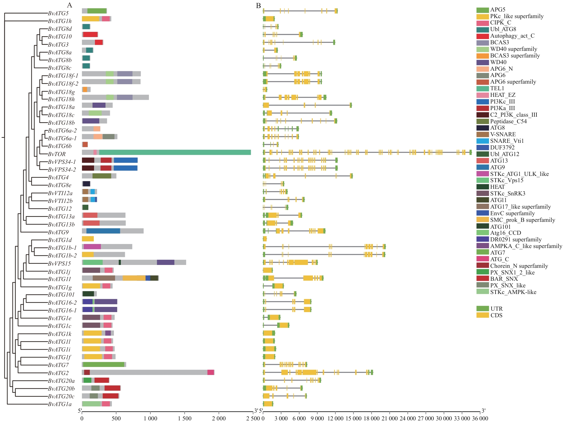 图5 甜菜BvATGs基因家族的共线性分析A:ATGs基因家族种内共线性分析;B:甜菜与拟南芥和水稻之间ATG基因的共线性分析