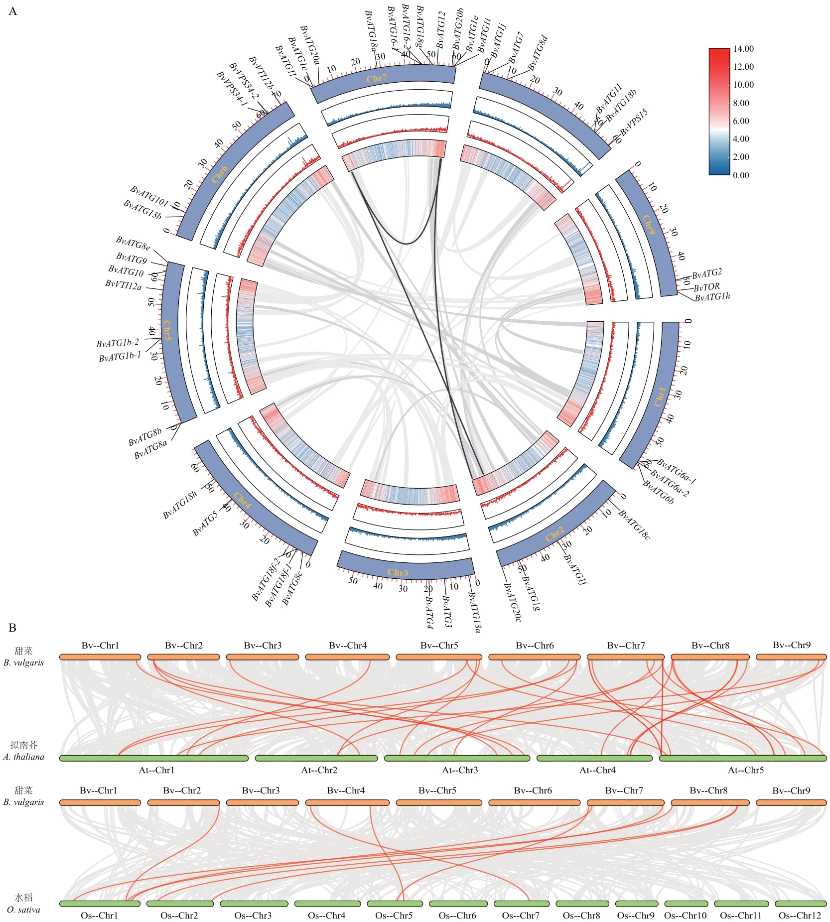 Fig. 5 Collinearity analysis of BvATGs gene family in sugar beetA: ATGs gene family intraspecies collinearity analysis. B: Synteny analysis of ATG genes between sugar beet (B. vulgaris), rice (O. sativa) and A. thaliana