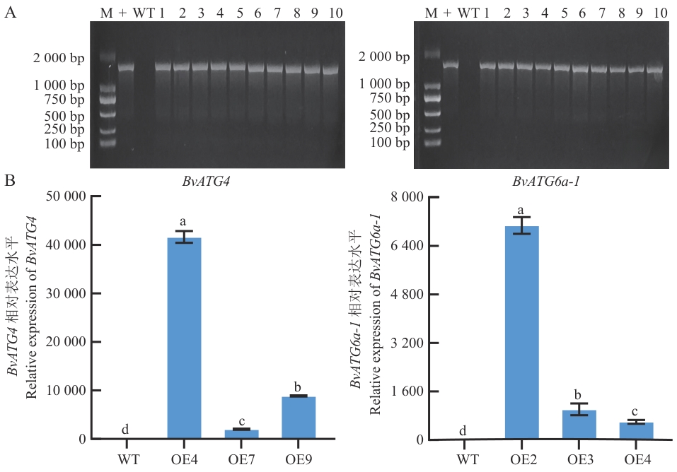 图8 BvATG4和BvATG6a-1转基因拟南芥鉴定A:BvATG4和BvATG6a-1转基因拟南芥基因组DNA PCR检测;B:BvATG4和BvATG6a-1转基因拟南芥RT-qPCR检测;M:DL2000分子量标记物;+:pEG-BvATG4、pEG-BvATG6a-1质粒;WT:野生型拟南芥;1‒10:BvATG4和BvATG6a-1转基因拟南芥;OE4、OE7、OE9:BvATG4转基因拟南芥;OE2、OE3、OE4:BvATG6a-1转基因拟南芥。将数据标准化为AtUBQ1表达水平