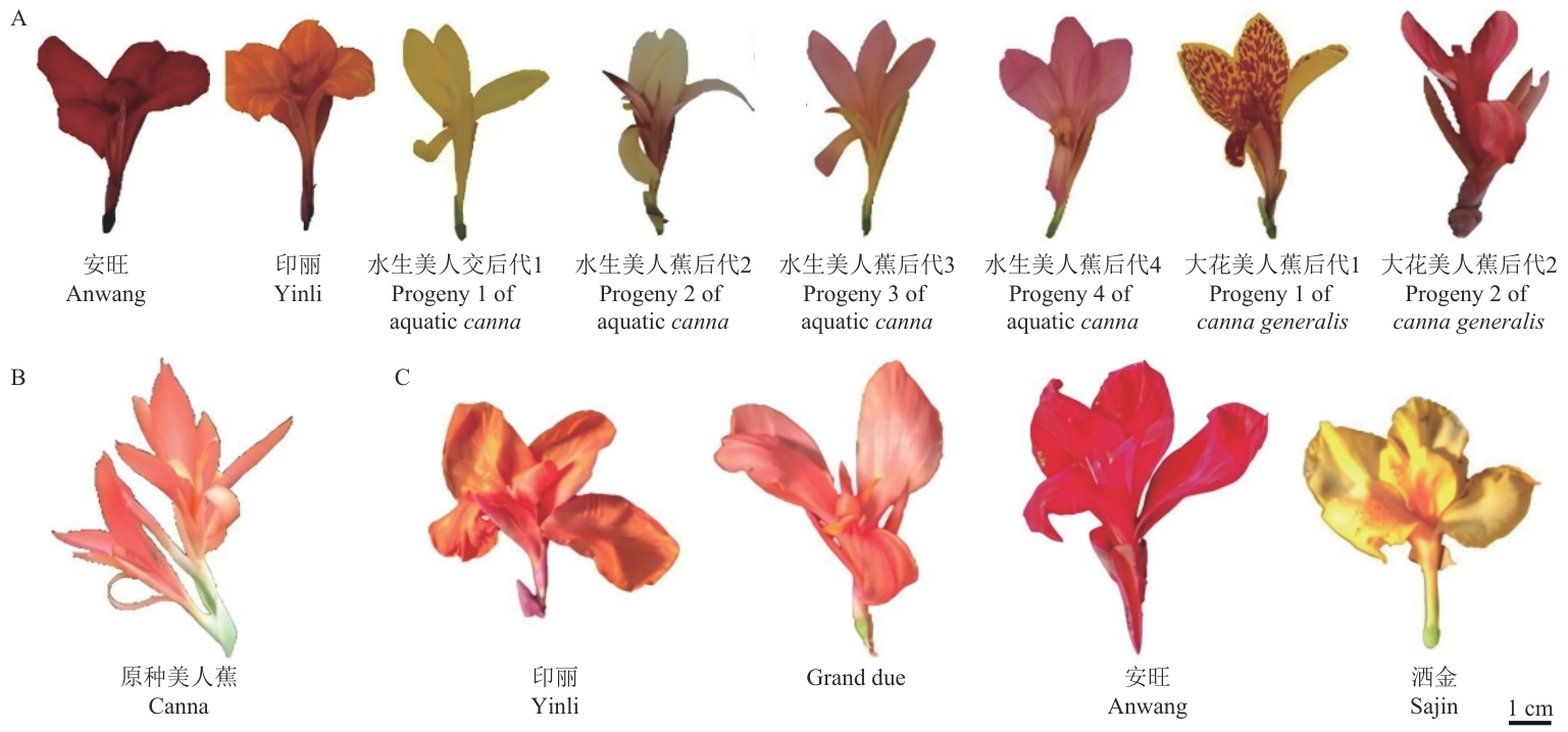图1 供试美人蕉材料表型A:转录组测序材料;B:基因组测序材料;C:RT-qPCR材料