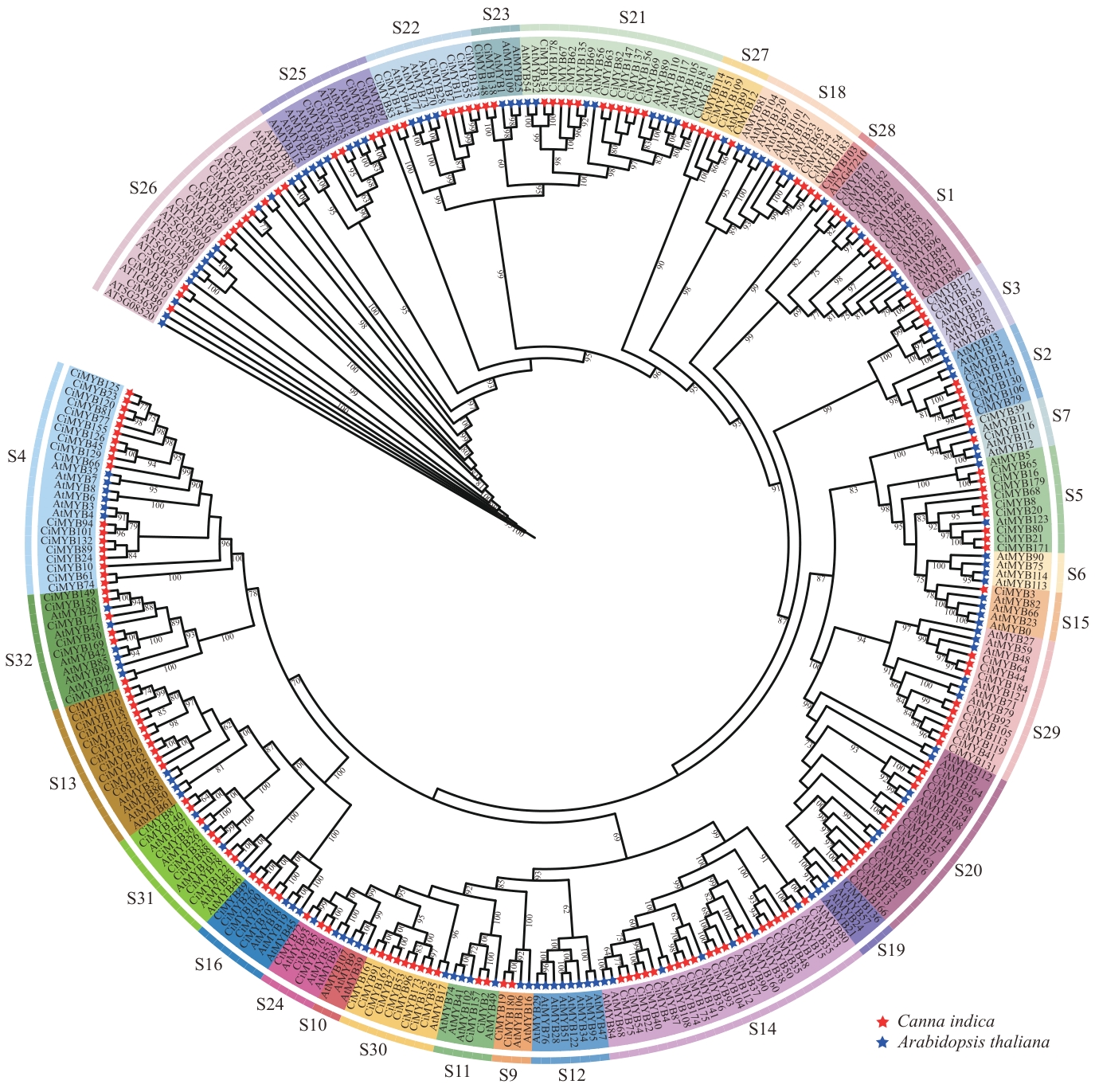 图5 美人蕉R2R3-MYB基因家族与拟南芥和水稻的蛋白序列共线性分析
