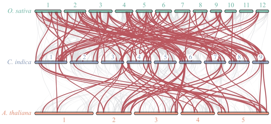 Fig. 5 Collinearity analysis of protein sequences of the R2R3-MYB gene family in C. indica, A. thaliana,and O. sativa