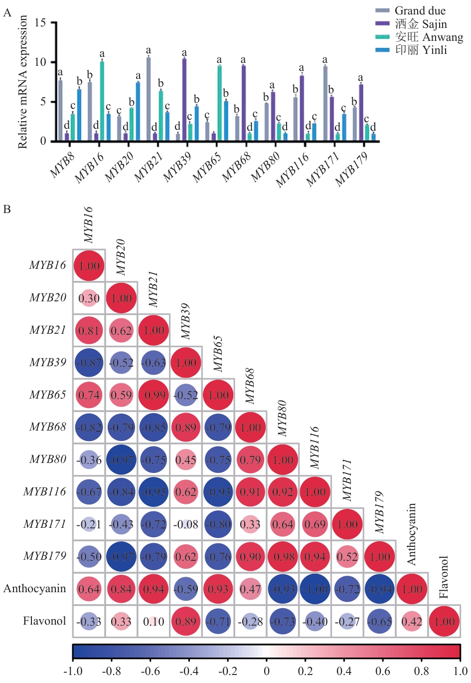 图11 候选R2R3-MYB基因在4个色系美人蕉品中的相对表达规律及相关性分析
