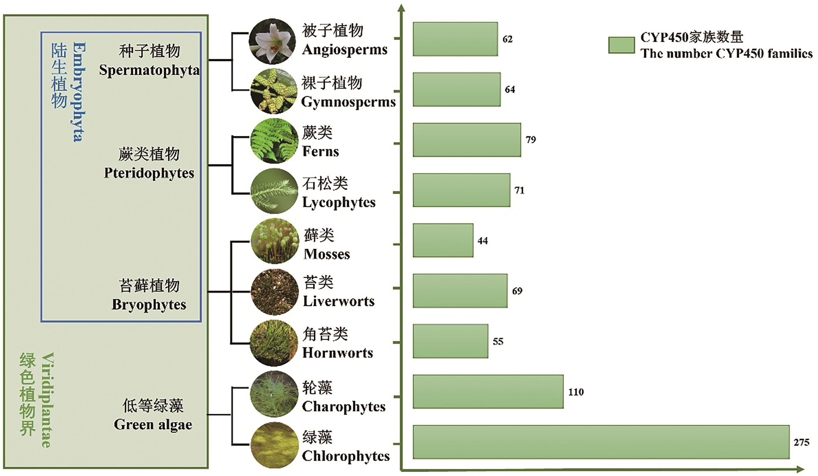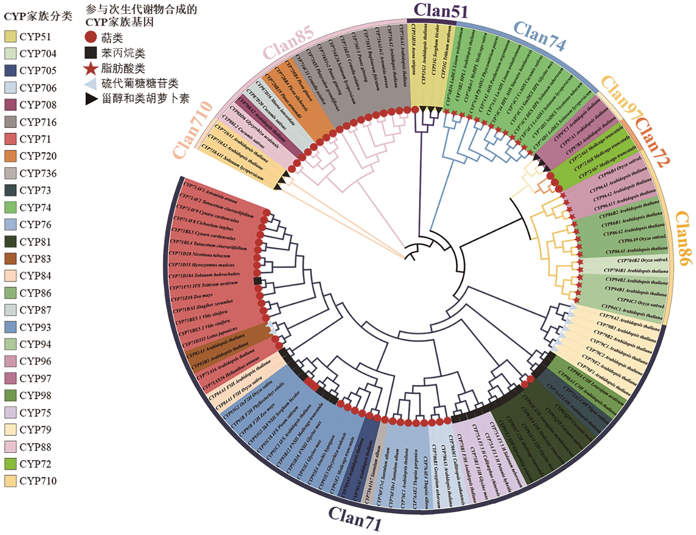 植物细胞色素P450(cytochrome P450, CYP450)酶是一类重要的血红素结合蛋白,该酶由于其还原态与一氧化碳结合后在450 nm有一处特征性的吸收峰而得名。作为植物中最大的单加氧酶超家族之一,CYP450酶通过催化羟基化、环氧化、脱烷基化等多种氧化反应,广泛参与生长发育、次生代谢合成及逆境防御等生物学过程,被誉为“万能的生物催化剂”。在生物胁迫(如病原菌侵害、虫害取食)条件下,植物通过激活CYP450介导的苯丙烷类、萜类、脂肪酸类、硫代葡萄糖苷类等多种次生代谢途径,合成具有抗虫或抗菌活性的化合物,从而增强植物抵御病虫害的能力。近年来,随着高通量测序技术和分子生物学的发展,已在多种植物中对参与相关生物过程的CYP450酶进行了分离、筛选及功能鉴定。鉴于此,本文结合CYP450酶的命名、结构特点以及在植物中的分类和分布,重点介绍CYP450家族基因在植物次生代谢物合成以及生物胁迫响应方面的研究进展,为植物CYP450家族基因的挖掘及功能研究提供参考,同时为基于此的次生代谢物合成及生物胁迫响应中的作用提供依据。