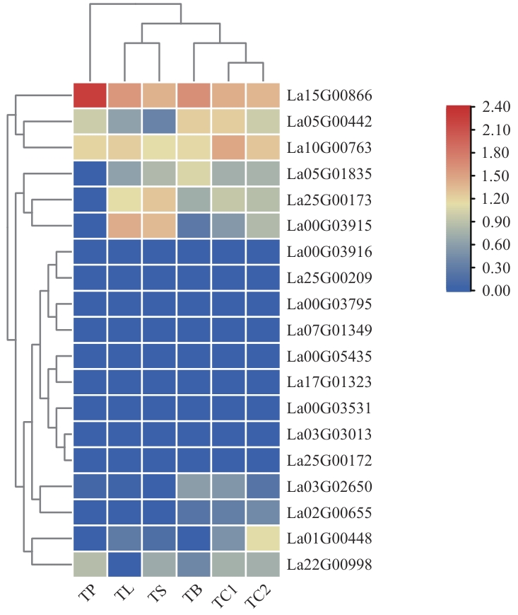图5 LaCuAO家族基因在薰衣草不同组织的表达TP:花瓣;TL:叶片;TS:茎;TB:花蕾;TC1:新鲜花萼;TC2:成熟花萼
