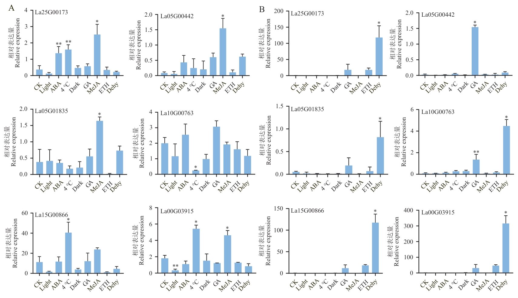 图6 LaCuAO基因不同处理下薰衣草花蕾(A)和叶片(B)中的表达模式* P<0.05, ** P<0.01