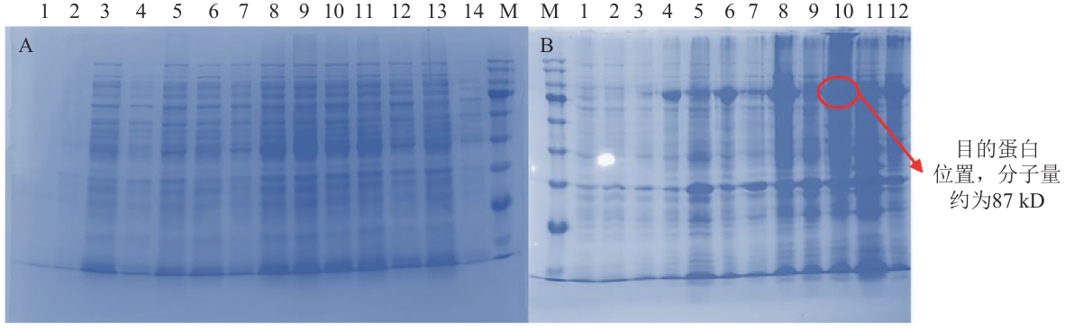 Fig. 7 SDS-PAGE gel electrophoresis patternA: Protein bands of the supernatant after centrifugation. B: Protein bands of precipitation. M: Marker. 1‒2: Blank control before and optimization (not induced). 3‒14 indicate the protein expressions sampled every 2 h at 2‒12 h after induction