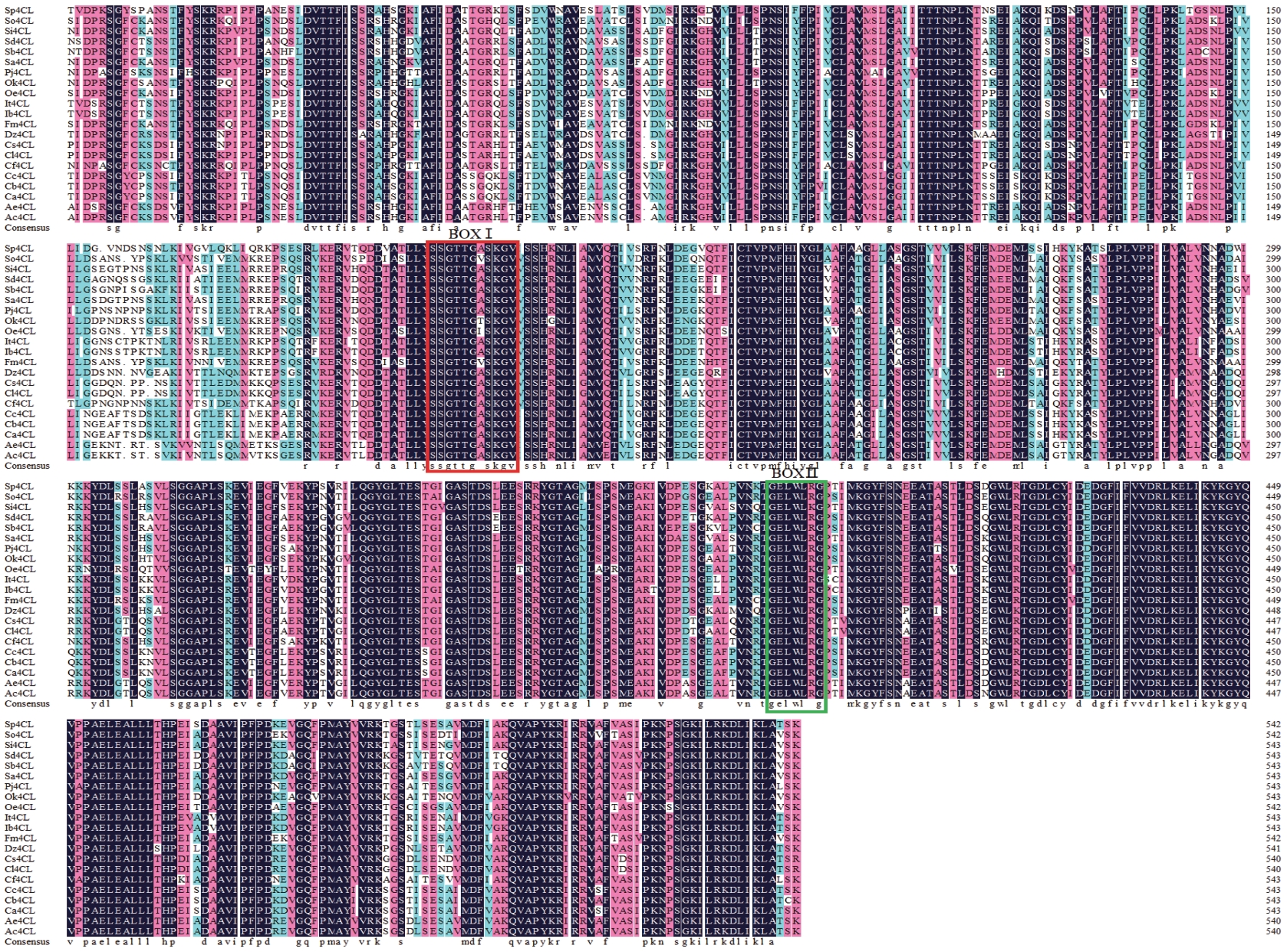 Fig. 3 Alignment and analysis of So4CL with 4CL protein sequences of other speciesThe black, red, and blue parts indicate homology =100%, ≥75%, ≥50% respectively. Red boxes are SSGTTGLPKGV conserved motifs, and green boxes are GEXXIXG conserved motifs
