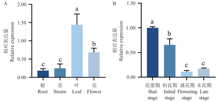 Fig. 5 Expression patterns of So4CL at different organs (A) and in different flower developmental stages (B)Different lowercase letters indicate significant differences at the P<0.05 level