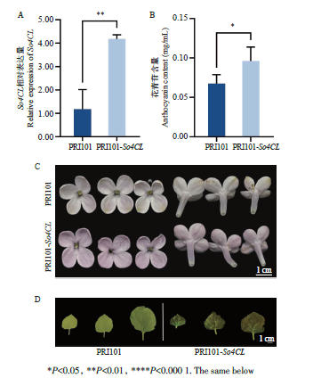 图7 紫丁香过表达So4CL植株的基因表达水平(A)、花青苷含量(B)、花色(C)和烟草过表达So4CL叶色变化(D)*P<0.05, **P<0.01, ****P<0.000 1. The same below
