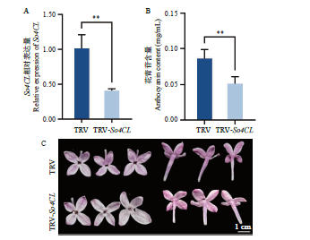 图8 紫丁香沉默So4CL 植株的基因表达水平(A)、花青苷含量(B)和花色(C)的变化