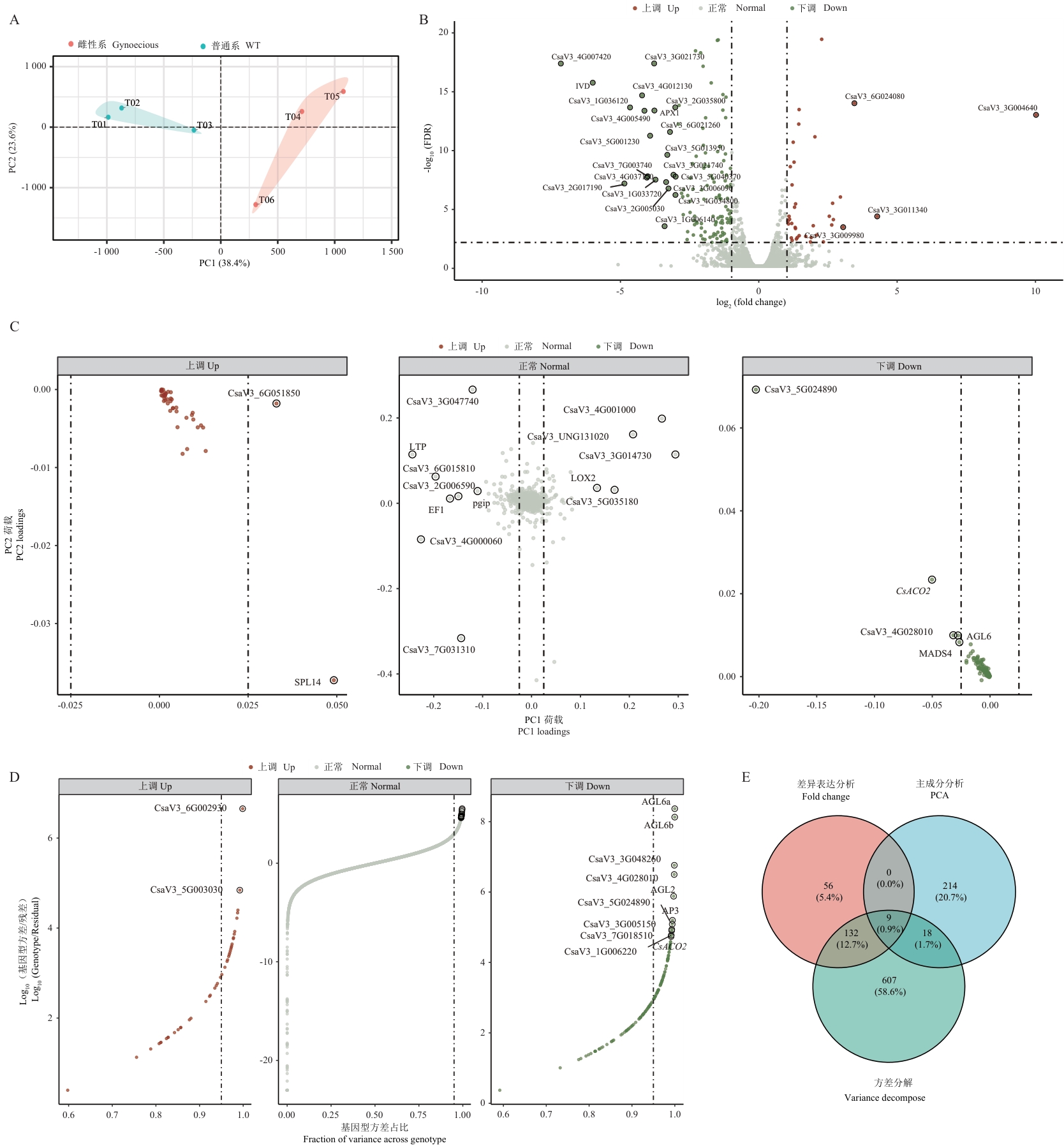 图1 黄瓜雌性系与普通系的转录组表达特征分析A:主成分分析(PCA)散点图展示样品间的整体表达差异;PC1和PC2分别解释38.4%和23.6%的表达变异;不同颜色表示不同基因型:雌性系(红色)和普通系(蓝色);B:火山图展示差异表达基因的分布;红色和蓝色点分别表示显著上调(43个)和下调(154个)的基因(|log2FC|>=1,FDR<0.01);突出显示了部分差异表达倍数超过3倍的基因;C:基因在PC1和PC2方向上的载荷值分布;点的颜色表示基因的差异表达状态;突出显示了部分具有高PC1载荷值的关键基因;D:基因表达方差分解分析;X轴表示基因型解释的方差占比,Y轴表示基因型方差与残差方差的对数比值;突出显示了部分基因型方差贡献率极高(图中示例为>0.99)的基因,以直观展示其表达主要受基因型驱动;E:韦恩图展示3种基因筛选方法(差异表达分析、主成分分析和方差分解)结果的重叠情况;数字表示各区域基因数量及占比