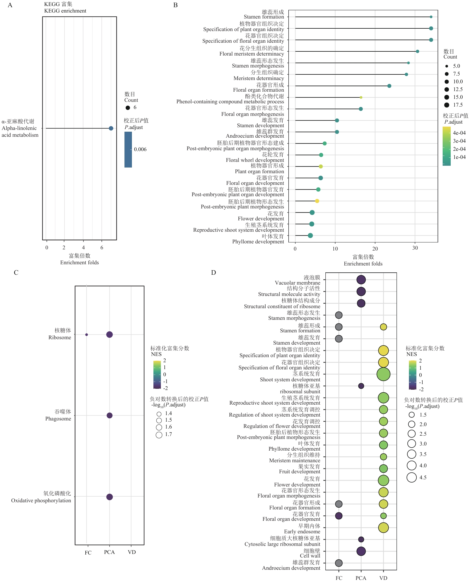 图2 功能富集分析揭示的关键代谢通路和生物学过程A:KEGG通路富集分析结果;气泡大小表示富集基因数目,颜色深浅表示校正后P值显著性水平;B:GO功能富集分析结果;气泡大小表示基因数目,颜色表示校正后P值;C:基于不同筛选策略的KEGG通路富集比较;热图中颜色表示富集得分(NES),黄色表示正向富集,蓝色表示负向富集;圆点大小表示显著性水平[-log10(P. adjust)];D:不同筛选策略获得基因集的GO功能富集比较;热图中颜色表示富集得分(NES),黄色表示正向富集,蓝色表示负向富集。圆点大小表示显著性水平[-log10(P. adjust)]。FC:差异表达分析,PCA:主成分分析,VD:方差分解