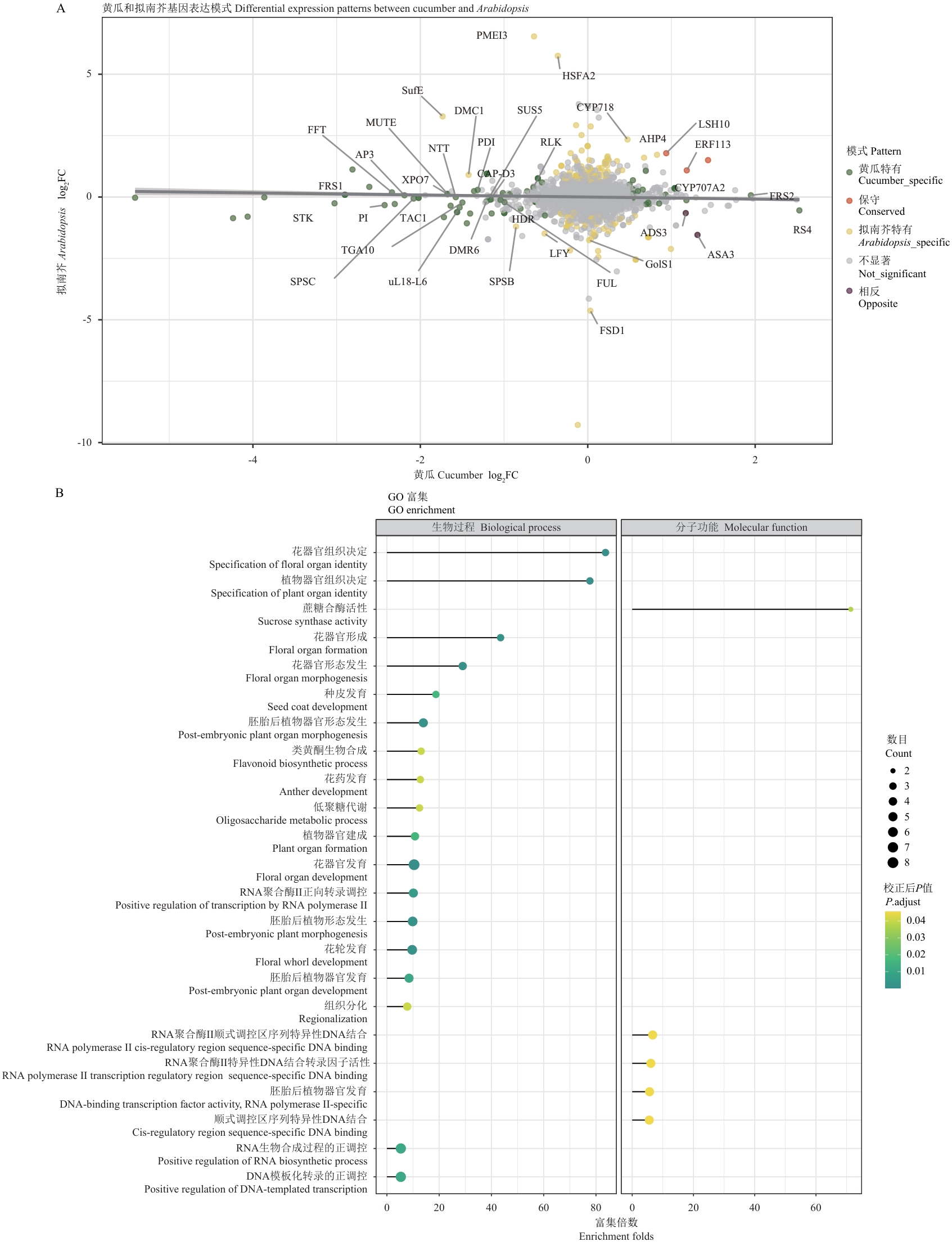 图3 黄瓜与拟南芥同源基因表达模式比较分析A:黄瓜和拟南芥同源基因表达变化的散点图;横轴和纵轴分别表示黄瓜和拟南芥中基因的log2FC值;点的颜色表示不同的表达模式;重要基因用基因名标注;B:黄瓜特异差异表达基因的GO功能富集分析;气泡大小表示基因数量,颜色深浅表示校正后P值显著性水平(P. adjust)