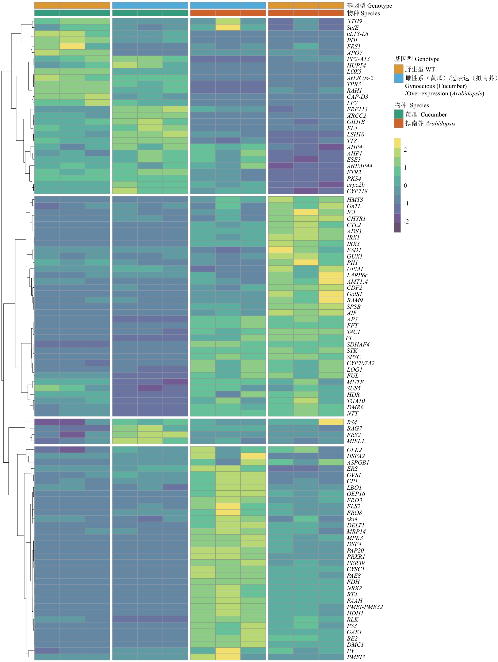 Fig. 4 Expression heatmap analysis of key genes in cucumber and ArabidopsisThe heatmap displays the expression patterns of 101 differentially expressed genes with gene symbol annotations in cucumber and Arabidopsis. Each row indicates a gene, and the colors indicate changes in gene expression levels: yellow indicates upregulated expression, while blue indicates downregulated expression. The genes are clustered based on their expression patterns. The annotation bar on the right shows the species origin and genotype. The FPKM values of each row (i.e., each gene) are normalized to Z-score scale