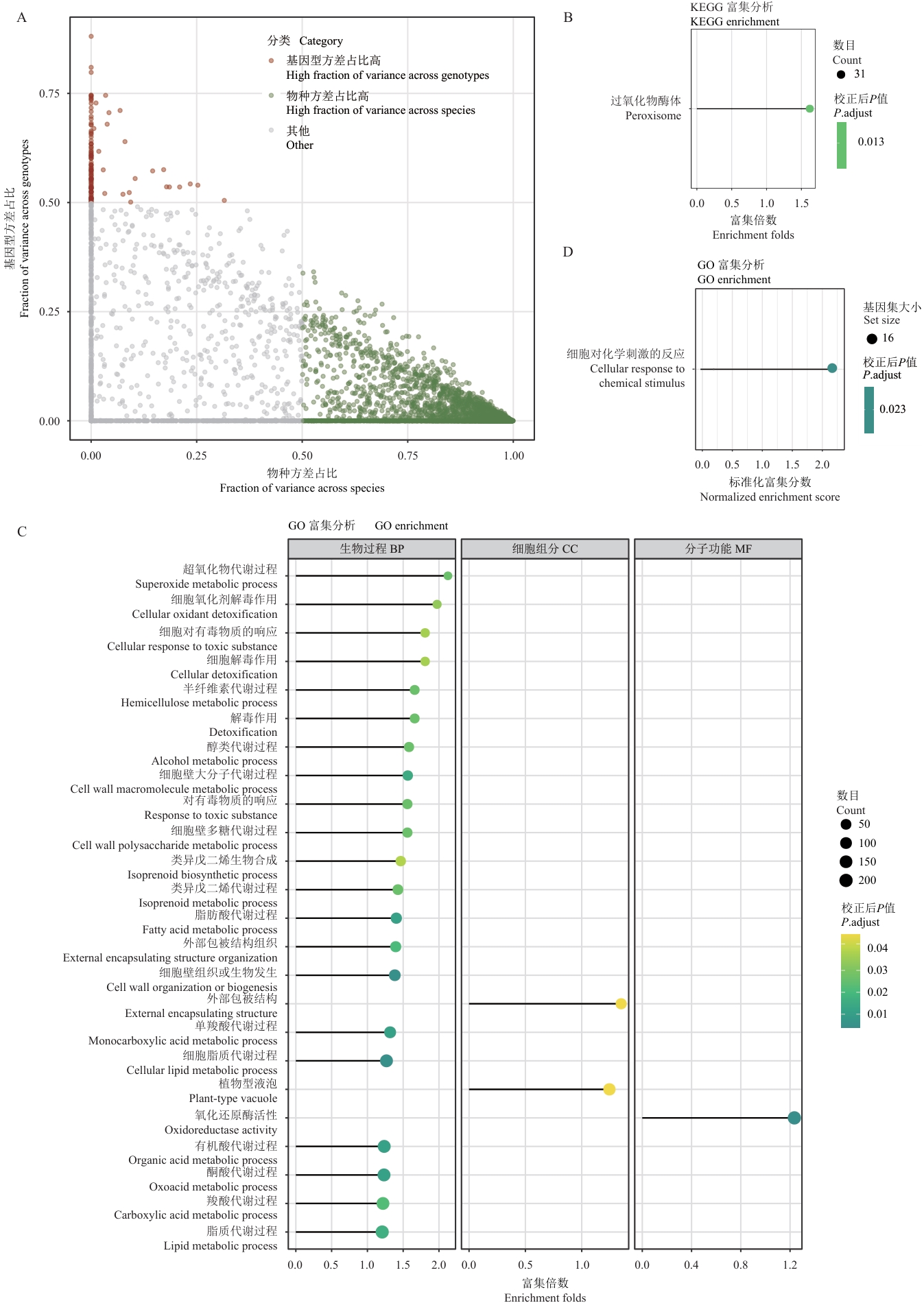 图5 物种和基因型特异性基因的功能分析A:基因表达方差分布图;X轴表示物种间方差占比,Y轴表示基因型间方差占比;点的颜色表示不同类别:基因型方差占比高(红色)、物种方差占比高(绿色)和其他(灰色);B:受基因型效应调控的基因KEGG通路富集分析结果;气泡大小表示基因数目,颜色深浅表示校正后P值,X轴表示富集倍数;C:受基因型效应调控的基因GO功能富集分析结果;气泡大小表示基因数目,颜色深浅表示校正后P值,X轴表示富集倍数;D:受基因型效应调控的基因GSEA富集分析结果;气泡大小表示基因数目,颜色表示校正后P值,X轴标准化富集分数(NES)