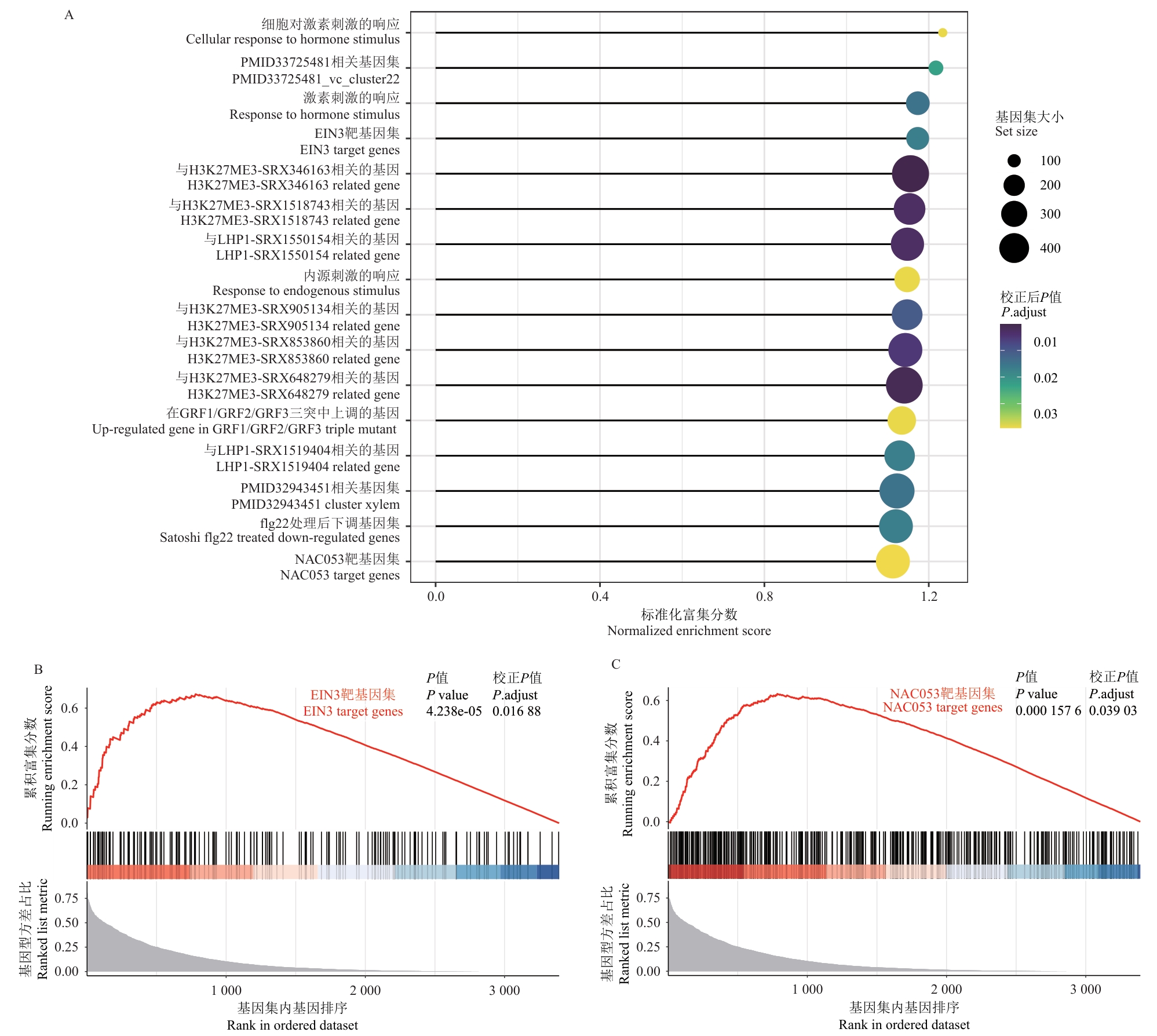 图6 PlantGSAD基因集富集分析A:受基因型效应调控的基因PlantGSAD基因集富集分析结果;棒棒糖图展示了显著富集的PlantGSAD基因集,气泡大小表示基因集大小,颜色深浅表示校正后P值,X轴表示标准化富集分数;B:EIN3靶基因集的富集分析结果;上方面板显示累积富集分数,下方面板展示基因在基因型方差占比排序中的分布;C:NAC053靶基因集的富集分析结果;同样展示了累积富集分数和基因分布图