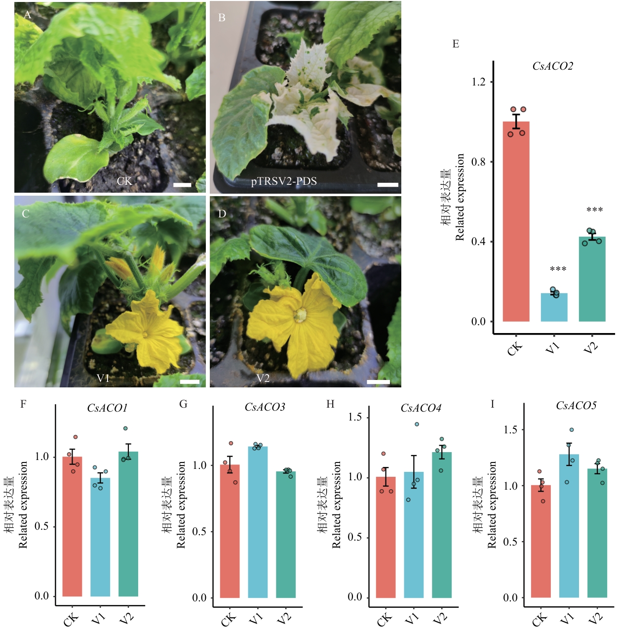 图7 黄瓜雌性系CsACO2基因的VIGS分析A:阴性对照(pTRSV2-空载体,CK),侵染后的雌性系黄瓜(X8g)只产生正常的雌花;B:阳性对照(pTRSV2-PDS),侵染后X8g植株的真叶出现明显的光漂白(白化)现象,证明VIGS系统有效;C:沉默CsACO2(pTRSV2-CsACO2, V1),侵染后的X8g植株上出现了雄花;D:沉默CsACO2(pTRSV2-CsACO2, V2),侵染后的X8g植株上出现了两性花;标尺=1 cm;E‒I:RT-qPCR检测结果显示CsACO2基因在沉默植株中表达显著下调,而其他ACO家族成员(CsACO1、CsACO3、CsACO4、CsACO5)表达无显著变化;CK:空载体对照;V1、V2:2个独立的CsACO2沉默植株;柱状图显示相对表达量(平均值±标准差),*** P<0.001