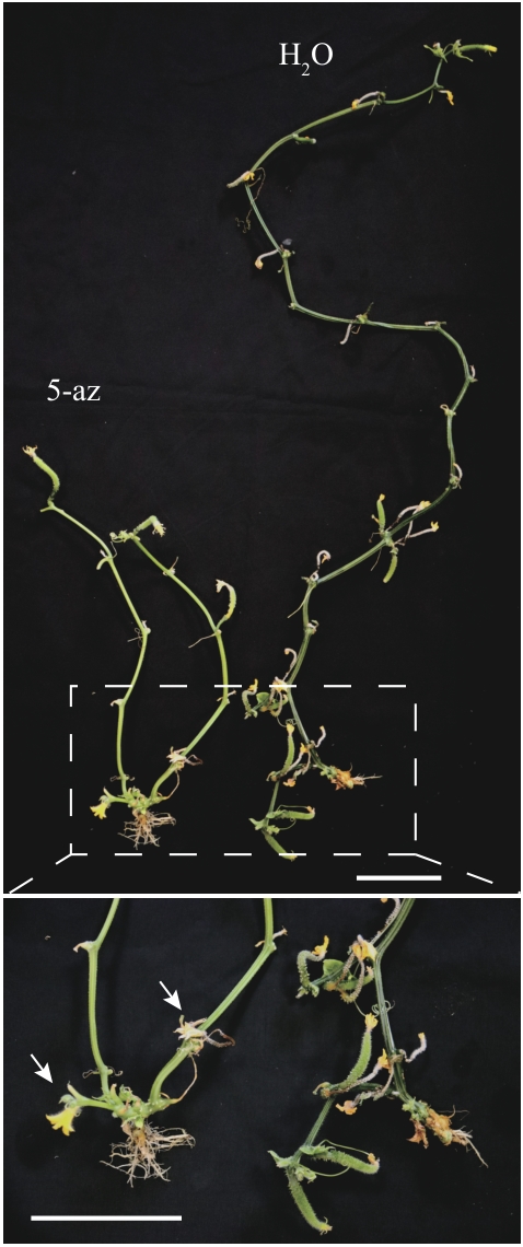 Fig. 8 Chemical treatment of gynoecious cucumber with the DNA methylation inhibitor 5-azacytidinePhenotypic difference between the 5-azacytidine treatment group (5-az) and control group (H2O). The control gynoecious X8g plant grows normally and produces female flowers, whereas the 5-az-treated plant produces male flowers. Scale bar=10 cm