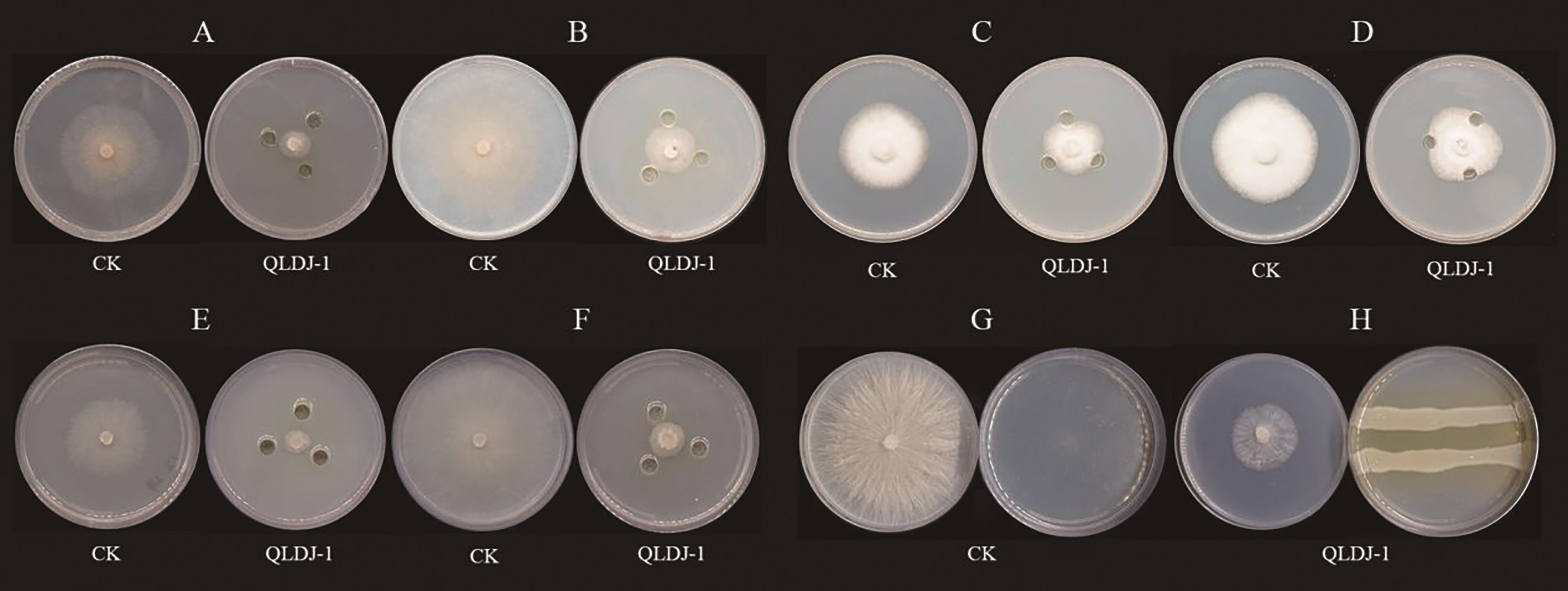 图4 QLDJ-1乙酸乙酯粗提物及气体挥发物拮抗效果A:烟草靶斑病24 h化合物拮抗,B:烟草靶斑病72 h化合物拮抗,C:芒果炭疽病96 h化合物拮抗,D:芒果炭疽病120 h化合物拮抗,E:立枯丝核菌12 h化合物拮抗,F:立枯丝核菌48 h化合物拮抗,G、H:48 h后立枯丝核菌气体化合物拮抗