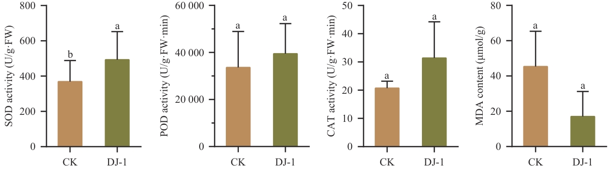 Fig. 6 Effects of QLDJ-1 on SOD, POD, CAT and MDA contents in tobacco leaves after inoculation with target spot disease pathogensDifferent lowercase letters indicate significant differences in the same column (P<0.05). The same below