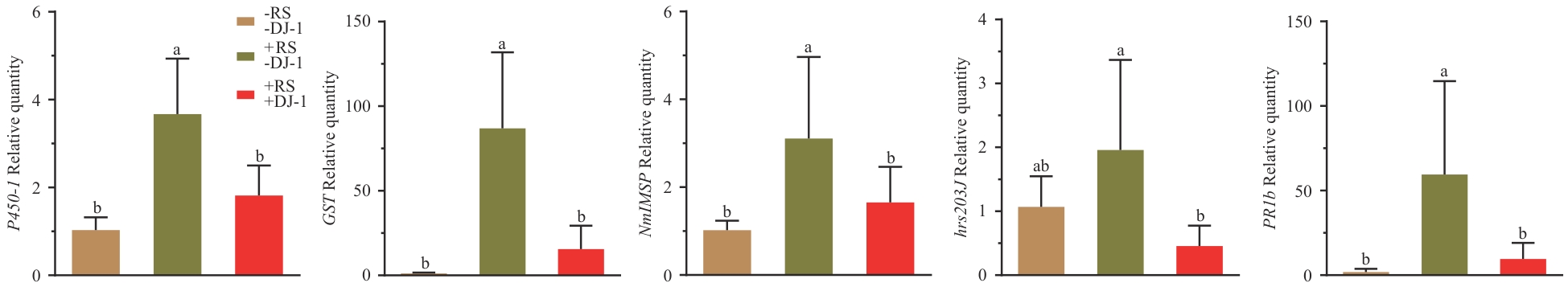 Fig. 7 Expressions of related genes in tobacco leaves treated with QLDJ-1 under disease stressRS: Rhizoctonia solani. DJ-1: QLDJ-1, +RS -DJ-1: CK