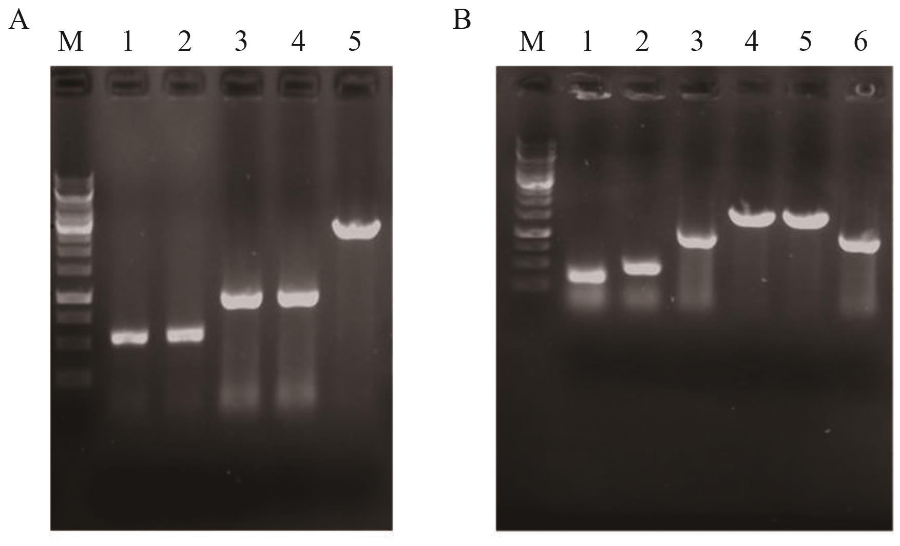 图10 菌株YL-15和YL-16鉴定图谱A为菌株YL-15鉴定图谱;M: marker;1:上游同源臂U brnQ;2:下游同源臂D brnQ;3: U brnQ -D brnQ;4:以YL-15基因组DNA为模板的PCR扩增产物;5:以YL-14基因组DNA为模板的PCR扩增产物。B为菌株YL-16鉴定图谱;M: marker;1:上游同源臂U yjiV;2:下游同源臂D yjiV;3:P trc -ygaZH-T trc;4:U yjiV -P trc -ygaZH-T trc -D yjiV;5:以YL-16基因组DNA为模板的PCR扩增产物;6:以YL-15基因组DNA为模板的PCR扩增产物