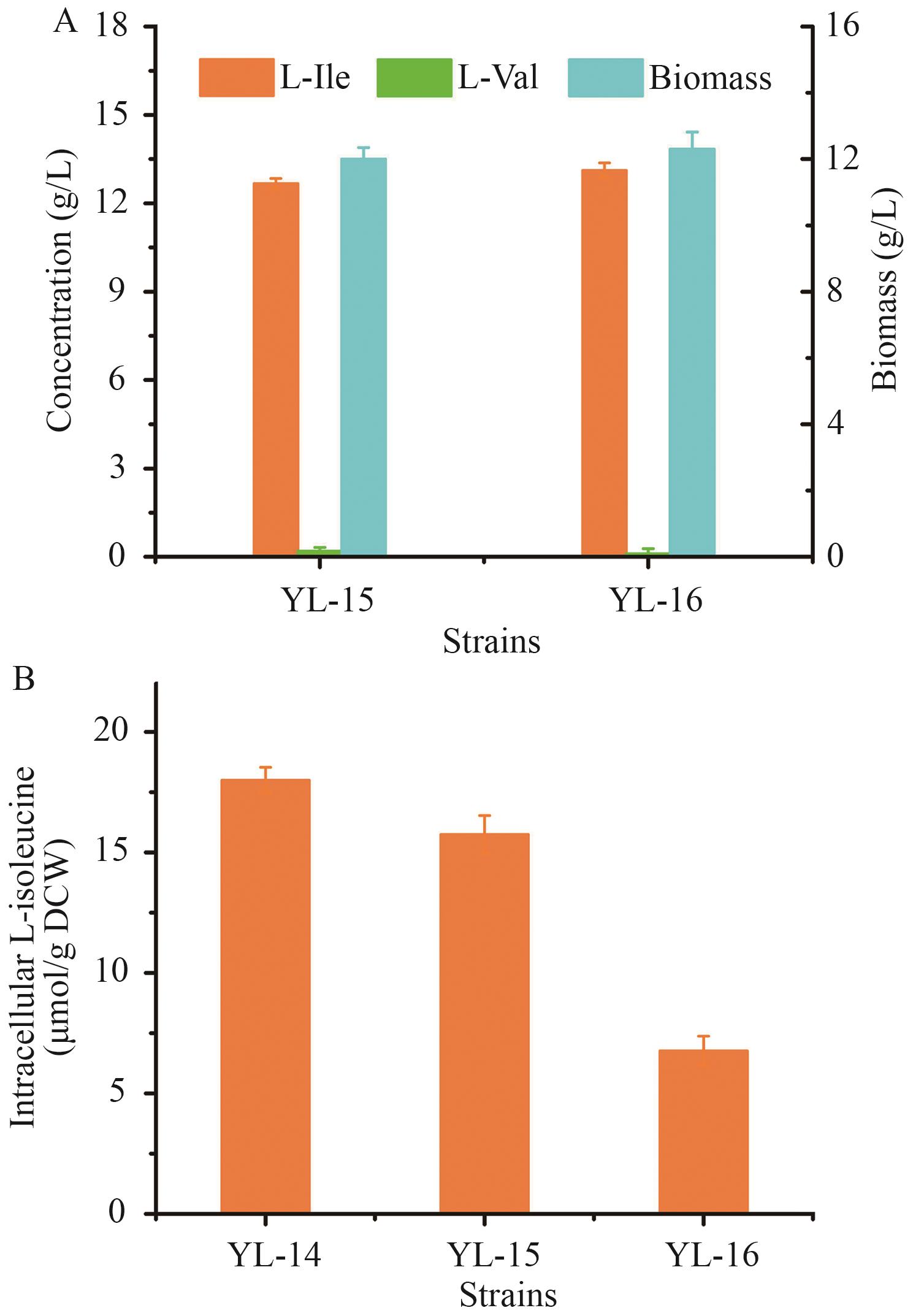 Fig. 11 Effects of modifying L-isoleucine transportation system on production performancesA: Fermatention performances of YL-15 and YL-16. B: Intracellular L-isoleucine levels in YL-14, YL-15, and YL-16