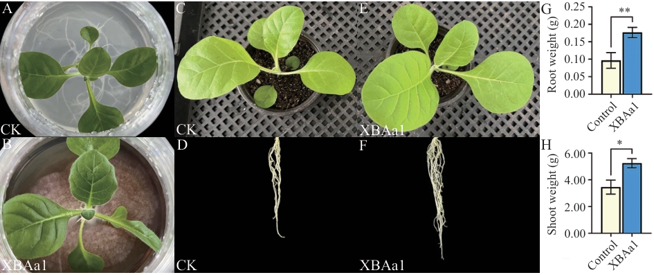 Fig. 2 Promoting effects of XBAa1 on early growth of tobacco under tissue culture and sterile substrate conditionsA, B: Tobacco-XBAa1 symbiosis in tissue culture. C, D, E, F: Above ground and root of the tobacco-XBAa1 symbiosis in the greenhouse. G: Root weight. H: Shoot weight (* P<0.05, **P<0.01, ***P<0.001, the same below)