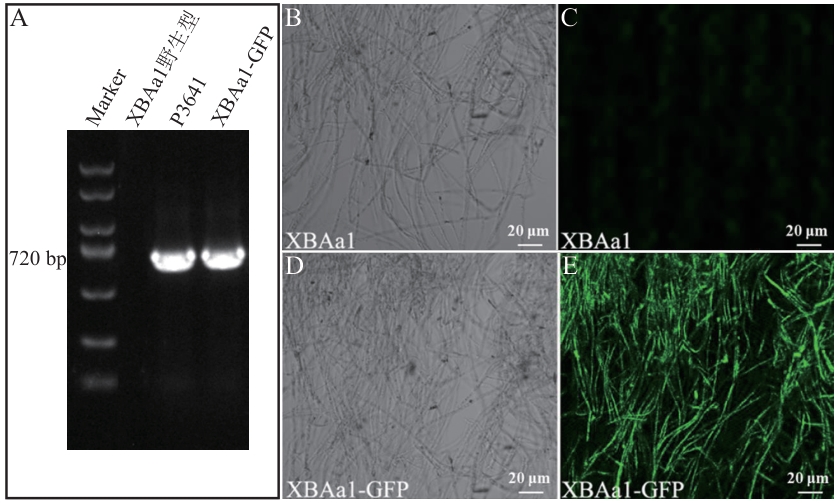 图6 XBAa1-GFP标记菌株PCR检测及其在烟草根内定殖的共聚焦显微镜观察(40×)